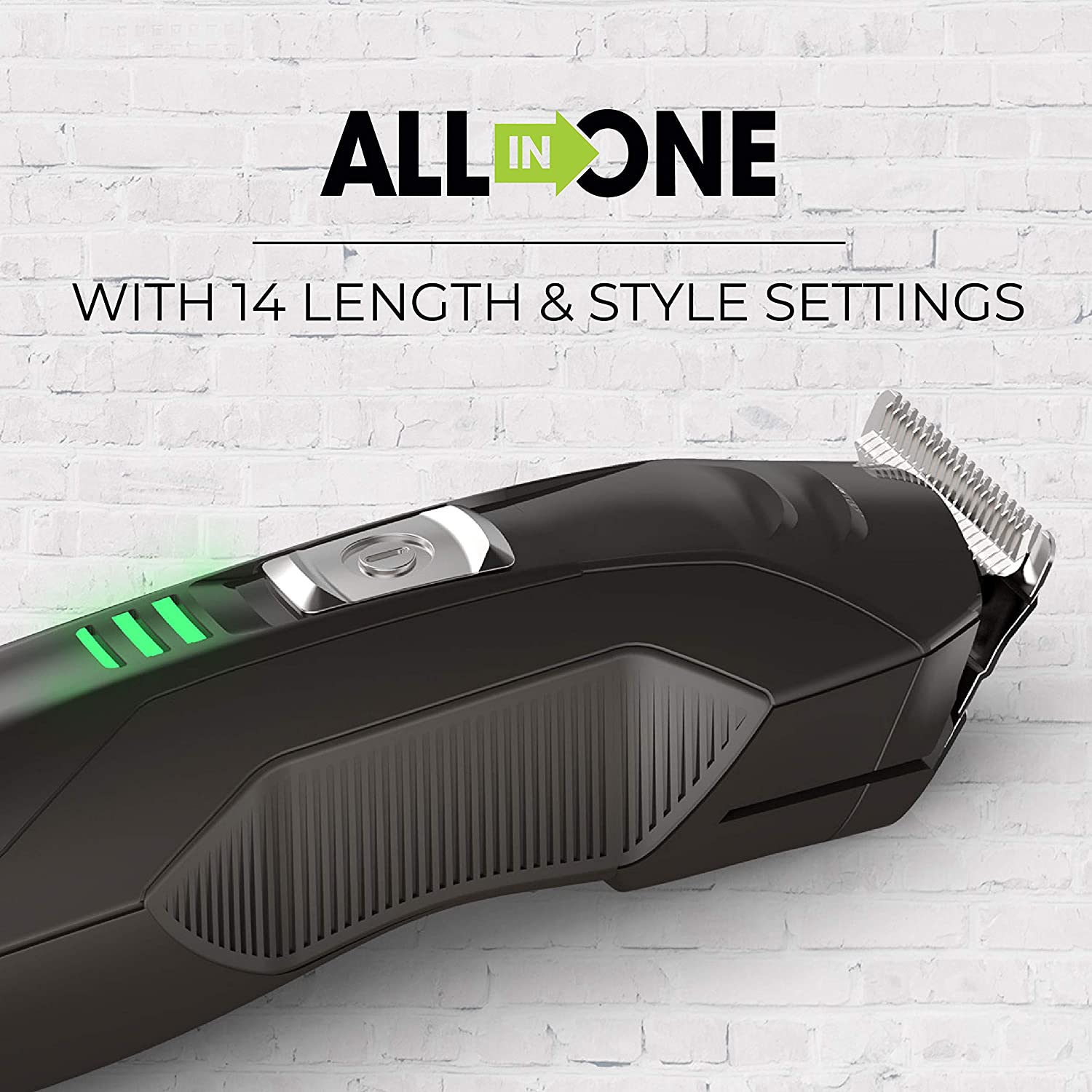 • 14 Settings for All Your Grooming Needs – Full-Size Trimmer; Nose, Ear, & Detail Trimmer; Detail Shaver; 8-Length Hair Clipper Comb; 3 Snap-On Beard and Stubble Combs