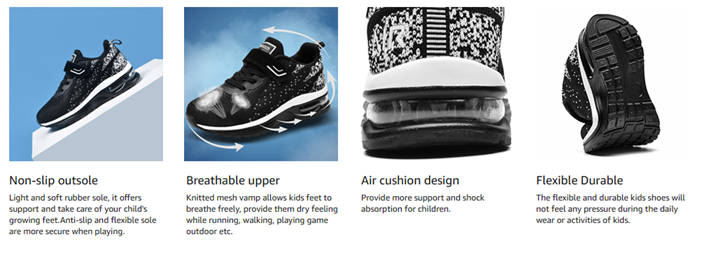 Air cushion design: Kids running shoes adopt an air cushion design to provide support and cushioning for the feet.