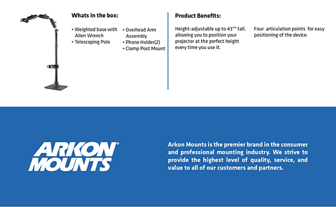 "This unique stand includes two universal holders: one for your pico projector and the other for your phone. Alternatively, it may also be used with two phones for videos, tutorials, or live stream video. PRIMARY USE: Pico Projectors (sold separately by third-party sellers ) are commonly used in the cookie decorating community. Unfortunately, the stands that come with them are usually too short, and are very flimsy. Arkon's Cookie Decorators Mount is different. It's a stand that is height-adjustable up to 43"" tall, allowing you to position your projector at the perfect height every time you use it. Many cookie decorators want to use a pico projector and also be able to use their mobile phone to record cookie decorating videos. This functionality is easy with the Cookie Decorators Mount. Insert your phone into the holder clamped onto the pole/post of the stand and tilt it downward to capture the action. For most pico projectors, the phone holder on the top arm assembly is the best way to grip your projector (those less than 3.9"" wide). However, the Cookie Decorators Mount also includes a camera adapter with standard 1/4""-20 threaded pattern, which is found on all pico projectors, digital video recorders, and cameras. SECONDARY USE: If you own two phones, you can be filming front-facing or overhead view videos with the phone holder on the top arm assembly. If in the overhead view position, you'll be able to use your phone mounted to the pole/shaft position to view the comments or your hand movements in a Facebook or Instagram live. Using two phones is also a great way to capture more than one camera angle for your videos. Both phone holders securely fit phones up to 3.9” wide, including Apple iPhone 11 Pro Max, iPhone 11 Pro, iPhone 11, iPhone XS Max, iPhone XS, iPhone XR, iPhone X, Samsung Galaxy Note 20 and Note 10, Galaxy S20, S10, and S9, and LG G6, G5, and G4."