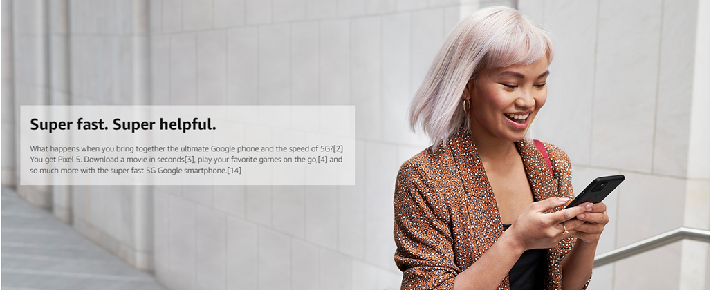 Meet Pixel 5, the ultimate Google phone with the speed of 5G.[2] It has the helpful stuff you need in a phone, with an extra boost of 5G speed. So you can download a movie in seconds,[3] take stunning ultrawide photos in any light, and keep going with an all-day battery that can last up to 48 hours with Extreme Battery Saver.[8] Pixel 5 also charges wirelessly,[6] keeps your data safe, blocks robocalls,[11] and is water-resistant.[10] It’s the super helpful 5G Google cell phone at a helpful price. And it’s an unlocked smartphone, so you can choose the data plan and carrier that work for you.[1]