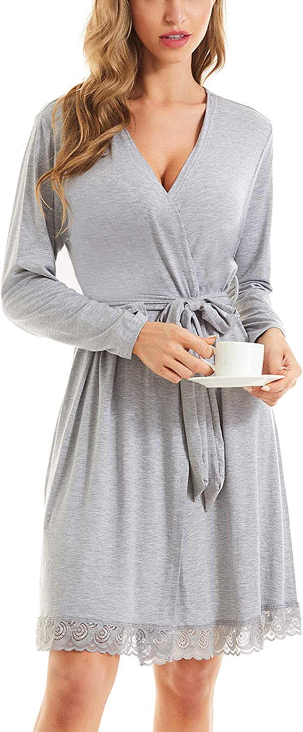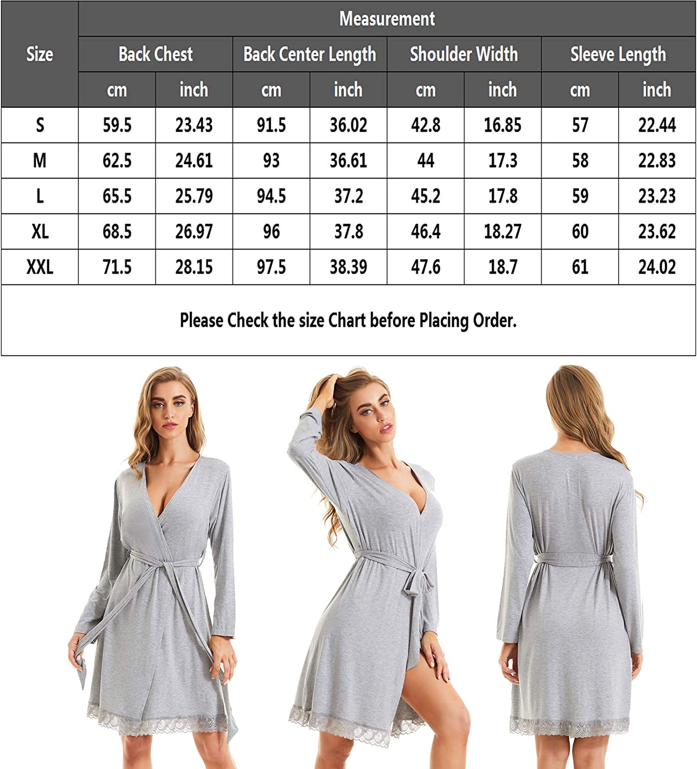 • ❀Novel Design: Womens bathrobe featuring a variety of popular elements -- long sleeve, solid color, belt, lace hem, v neckline design, inside ties. Inside ties keeps it from slipping open in addition to the outside belt. Lace hem and v neckline makes you more elegant and attractive. Perfect knee length sleep robes is convenient for women night sleepwear.