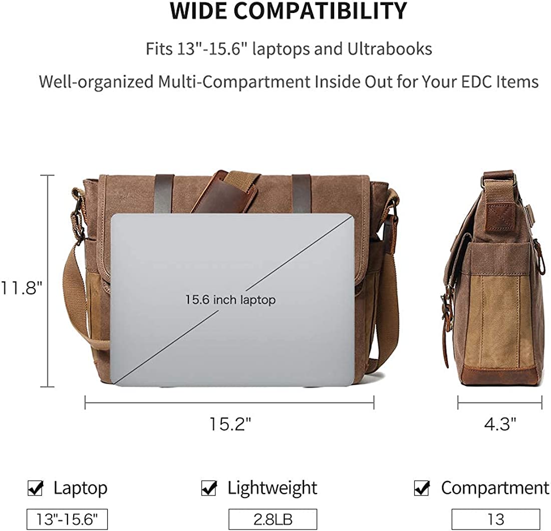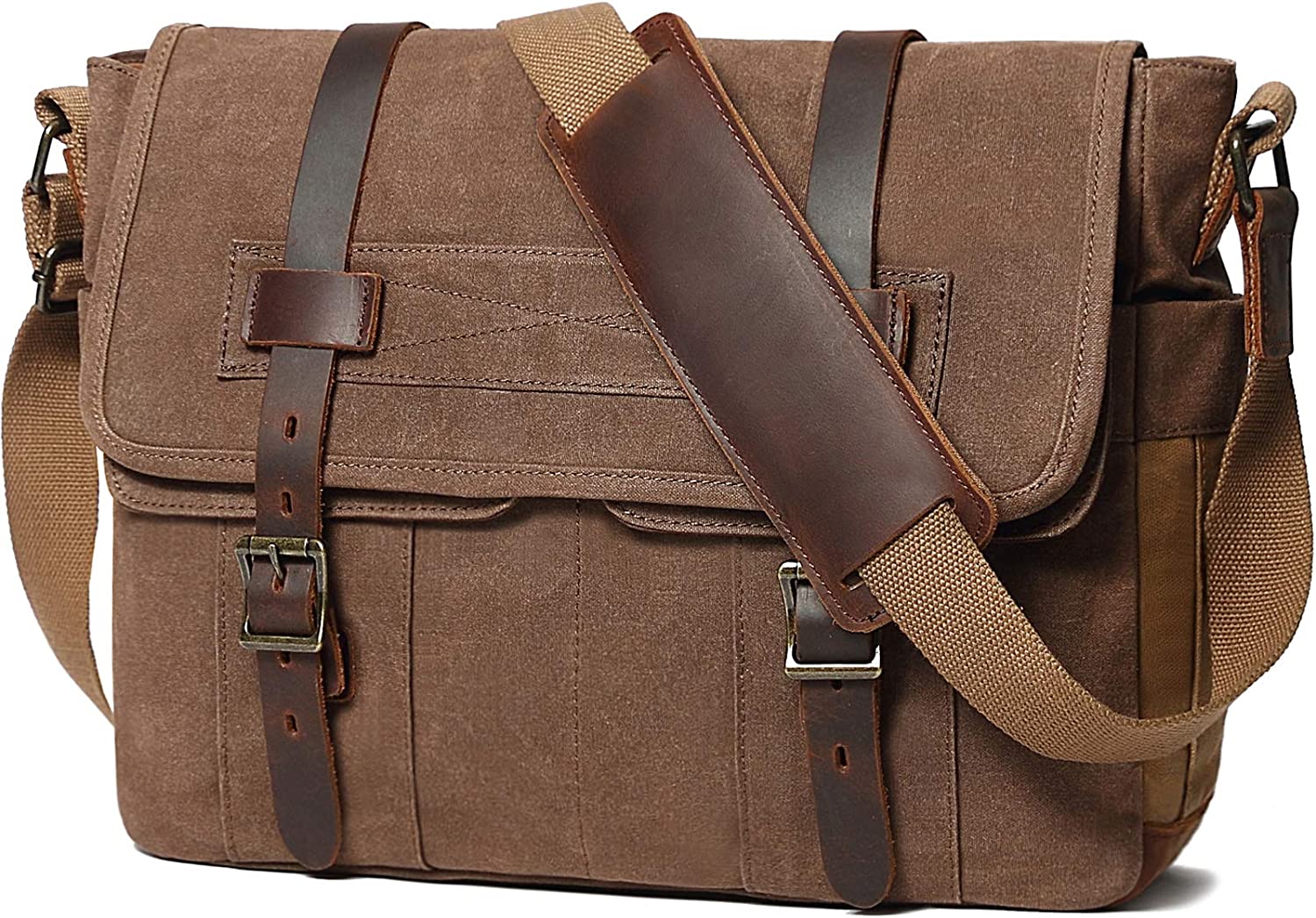* This laptop messenger bag is a perfect satchel bag you don’t want to miss. Presented in crazy horse genuine leather and rugged waxed canvas, disordered wrinkles and scratches on surface, as it presents the style of retro and wildness, which make you stand out of all.* Briefcase for men is equipped with plenty room of 13 pockets, ends chaos and keeps everything in neat. You can also take your laptop and tablet in it for business, school, everyday, overnight and other situations, as there is fully padded laptop sleeve and tablet sleeve with velcro.* Satchel bags for men can be carried as briefcase, sling bag, crossbody bag via the handle and shoulder bag.FeatureMaterial: Cowhide Genuine Leather & Rugged Waxed Canvas Color: Brown / GreyStructure Details* Outer:- 1 back pocket with zipper for books; - 2 pockets with magnetic snaps within the flap for easy-access; - 2 side pockets for small bottles and umbrella;* Inner:- 1 large compartment with fully padded in all sides for laptop; - 1 tablet compartment for protecting; - 1 zip pocket for your important belongings; - 1 large compartment for other things; - 1 Key clip to hang your key in right position; - 2 inner slip pockets for small gadgets; - 2 pen slots for your pen and sunglasses.Dimension* Messenger bag: 15.2"L * 4.3"W * 12.2"H* Laptop sleeve: 15"L * 10"WUpkeep1.Apply cream/moisture lotion onto the leather surface,and use a soft cloth to complete the upkeep.2.Avoid cleaning products with alcohol, turpentine or other mineral spirits as they will discolor and dry out leather.3.Never allow water to soak into your bag. If the bag gets wet, do not use a hair dryer on it. Instead, absorb as much water as possible with a thick microfiber hand towel and allow the bag to air dry.Package includes*1 x Leather Messenger Laptop Bag