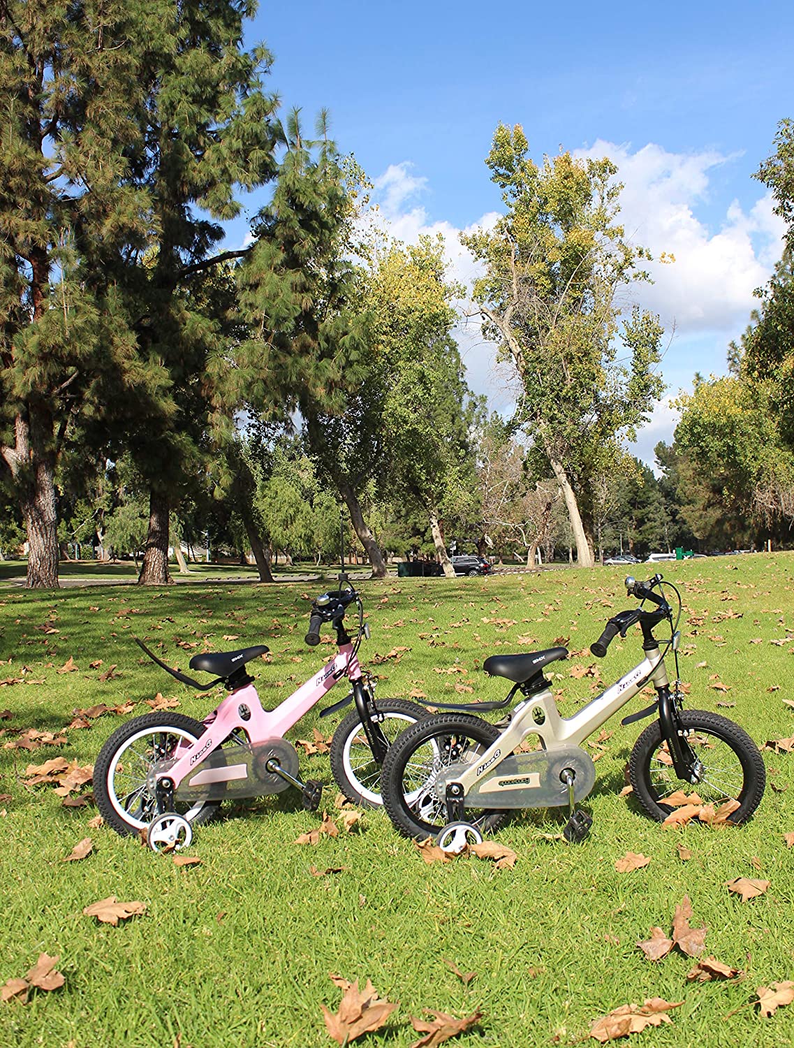 The bike is made with a lightweight magnesium alloy frame with zero welding, extra thick tires, is completed with a set of training wheels.