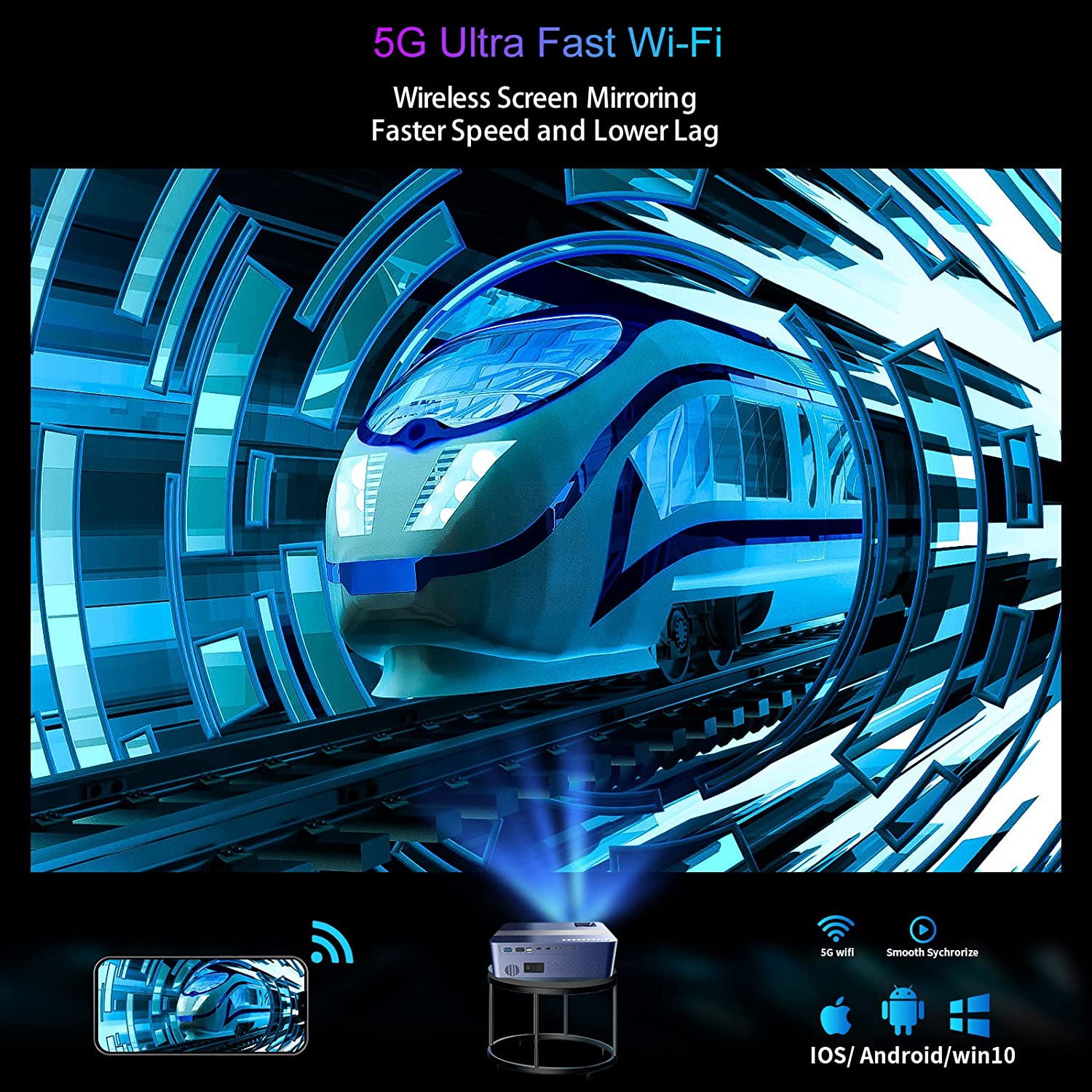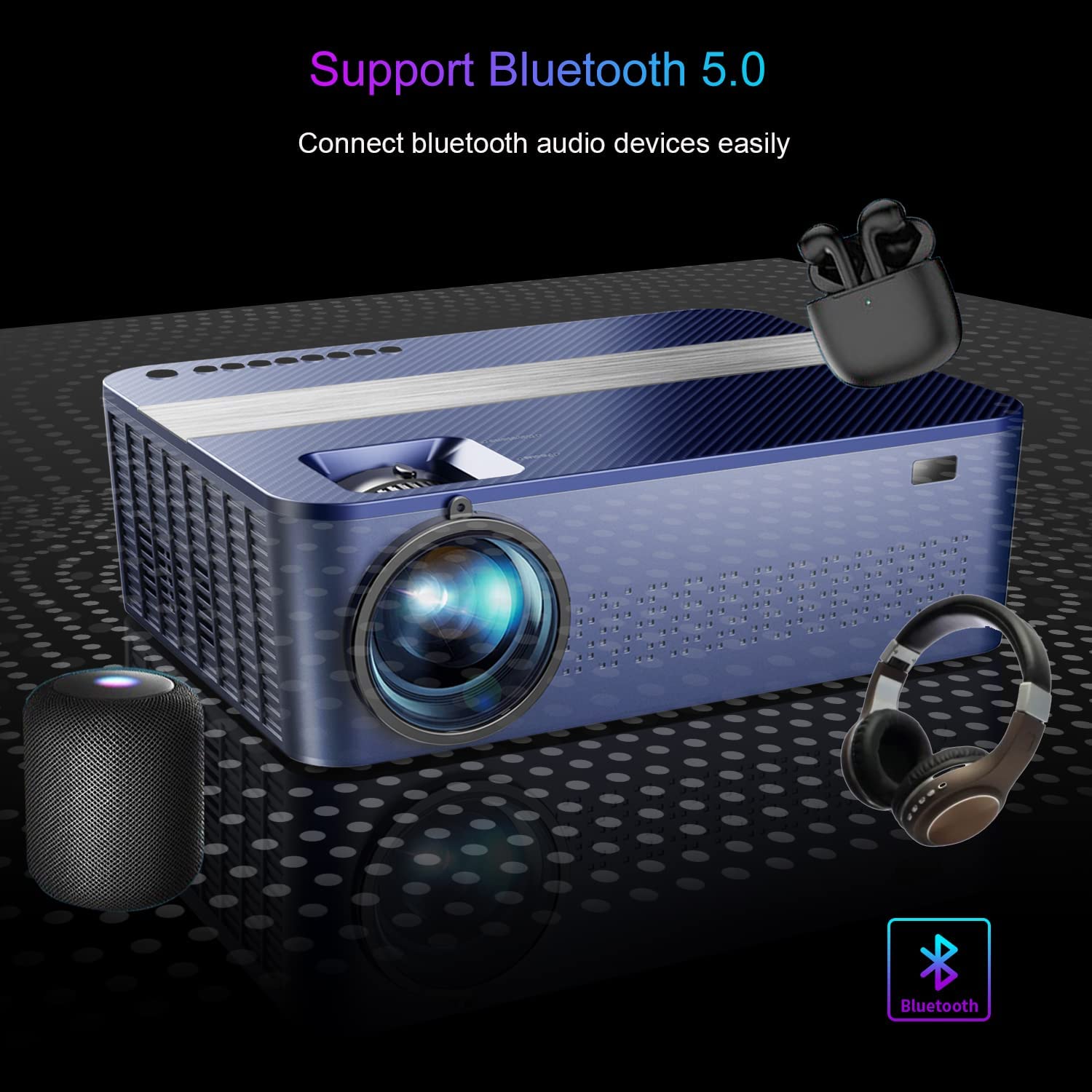 • 【Dual-band WiFi6 & Newest Bluetooth 5.2】 WiFi6 projector is compatible with 2.4GHz and 5GHz networks.Compared with the 5G network,it has three times faster speed, larger capacity for data transfer, and lower latency, which means our 4k projector with WiFi and Bluetooth can provide more stable and smoother transmission when used with a WiFi 6 router.With bluetooth 5.2, this bluetooth projector can easily connects to your ideal headphones, speakers, or other audio equipment.