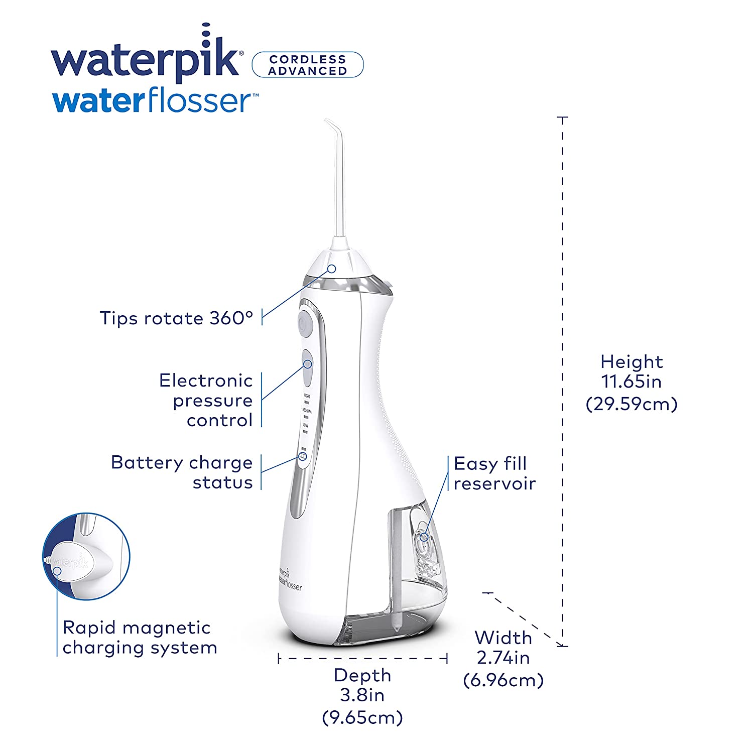 • ADVANCED HANDHELD CORDLESS WATER FLOSSER: Waterpik Cordless Advanced features a handheld design with quiet operation and a rechargeable battery. Convenient charger connects magnetically and charges in 4 hours; LED indicator lets you know when it's time to recharge.