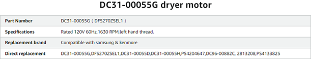 • ❤【Package Includes】1 × DC31-00055G dryer motor.Rated 120V 60Hz,1630 RPM,left hand thread.Made by OEM manufacturer.Premium materials and are tested so they last.2 YEAR WARRANTY.