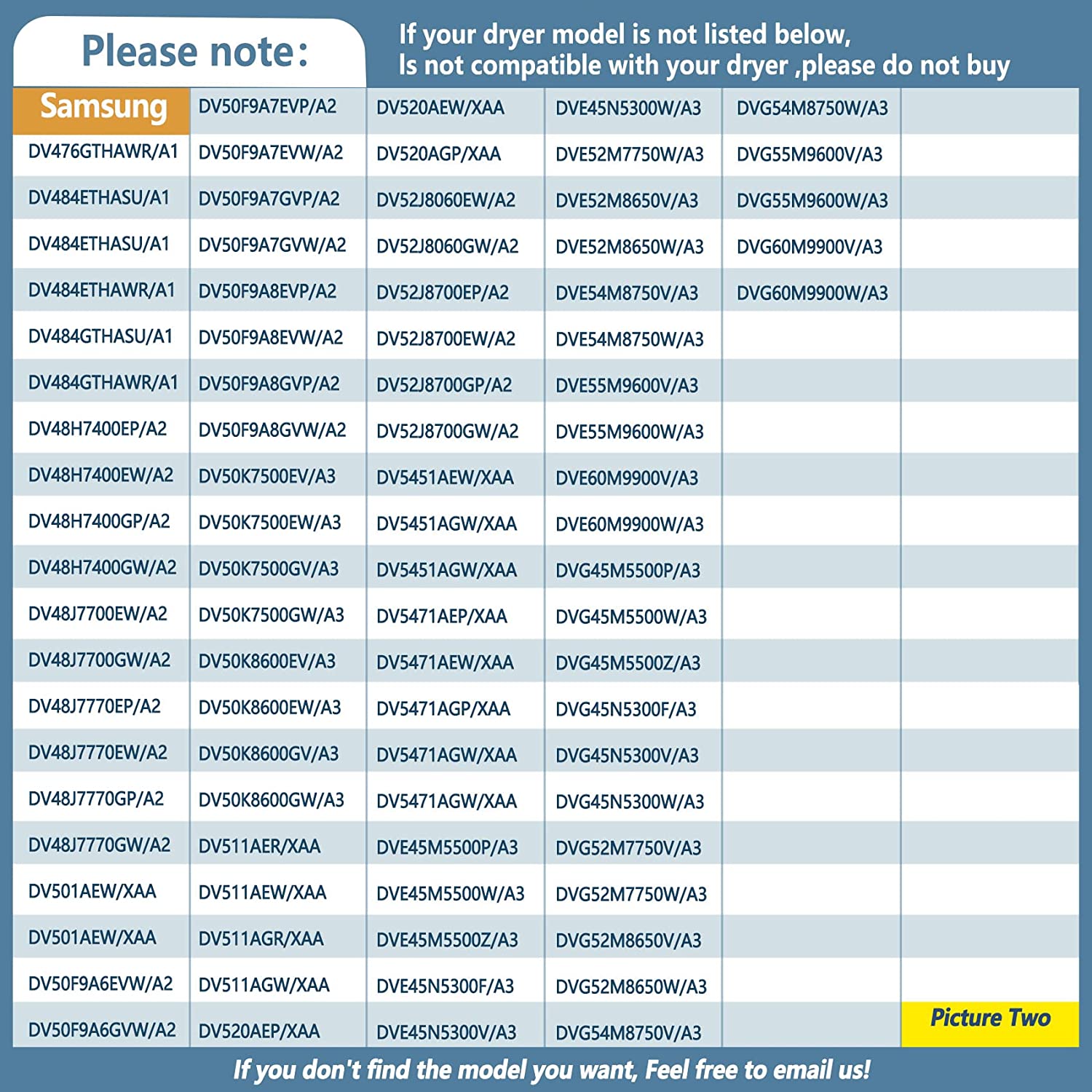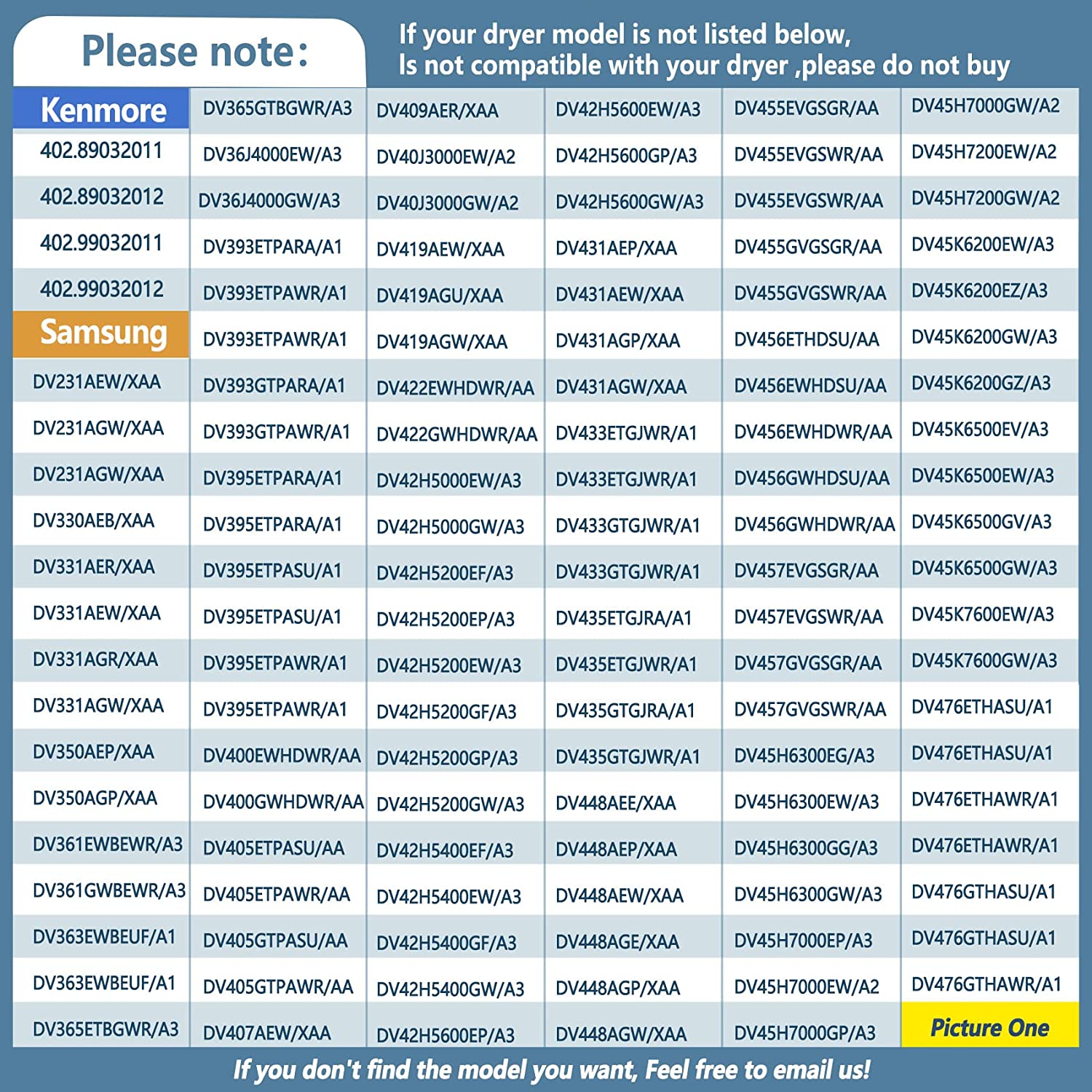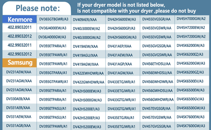 • ❤【Compatible models】Compatible with samsung: DV5471AEP/XAA-01,DV42H5000EW/A3-01,DV520AEP/XAA-02,DV520AEW/XAA-02,DV520AGP/XAA-02,DV419AEW/XAA-02,DV419AGW/XAA-02. DV511AEW/XAA-00,DV511AEW/XAA-01,DV511AEW/XAA-02,DV520AGP/XAA-03,DV520AGP/XAA-04,DV431AEW/XAA,DVG45N5300V/A3. DV5471AEP/XAA-01,DV331AGW/XAA,DV231AEWXAA0001,DV455EVGSGR/AA-02,DV419AEWXAA0002,DV448AGEXAA0002,DV448AGPXAA0002,ect. Kenmore: 40289032011,40299032011,40289032012,40299032012.