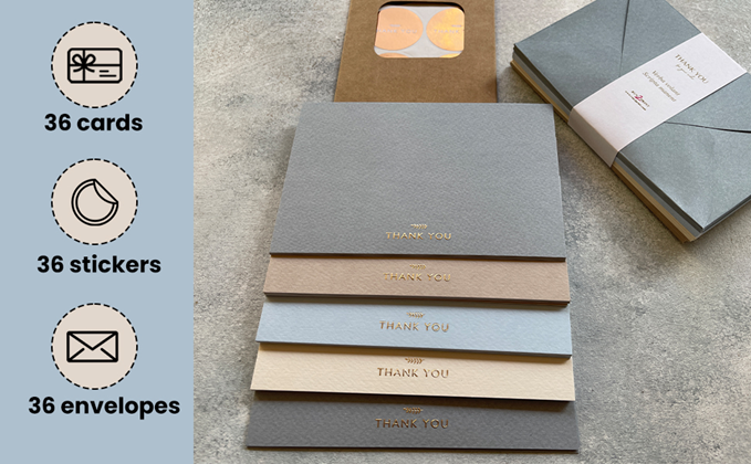 HIGH QUALITY MATERIAL - Solid and high end finish with 320 GSM Italian thick textured paper card embossed gold foil pressed. Non-glossy paper, means no fingerprints or scratches when handling these thank-you cards. Will not smudge or smear.