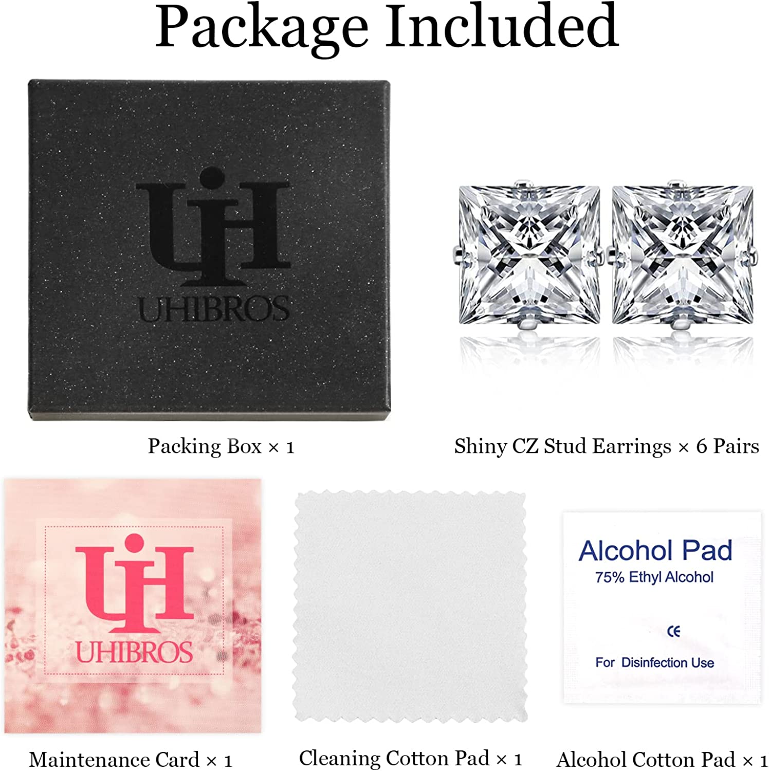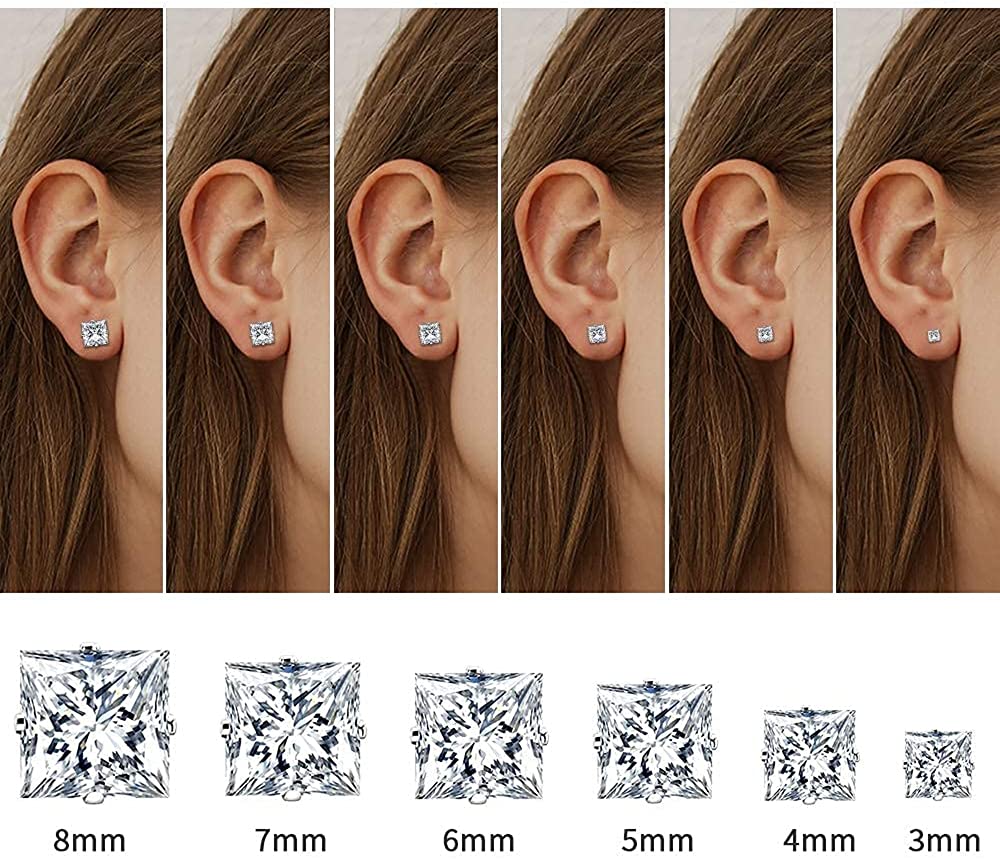 UHIBROS Stainless Steel Stud Earrings Set for Men, 14K White Gold Plated Square Cubic Zirconia Studs Hypoallergenic Mens Earrings Pack 6 Pairs