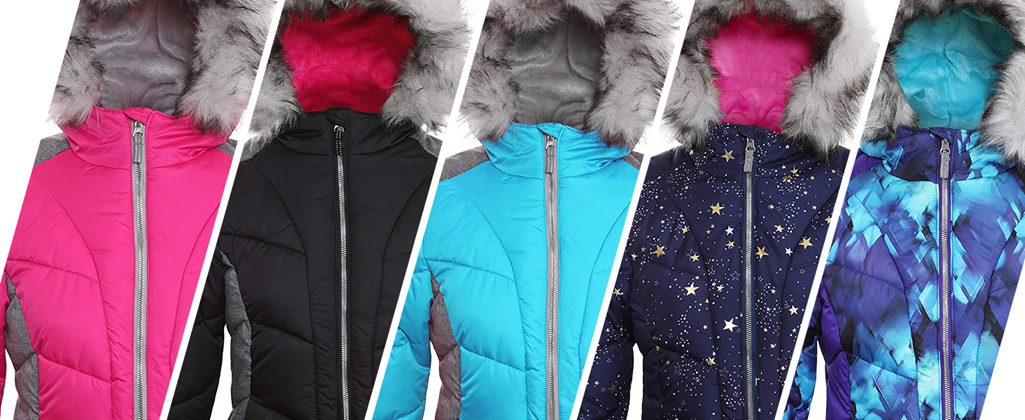 • Girls coats size 7/8, 10/12, 14, and 16; Metallic Grey, Black/Kobe Pink, Black/Purple/Blue, Light Sea Green/Grey, Purple/Pink/Blue, Blue/Kobe