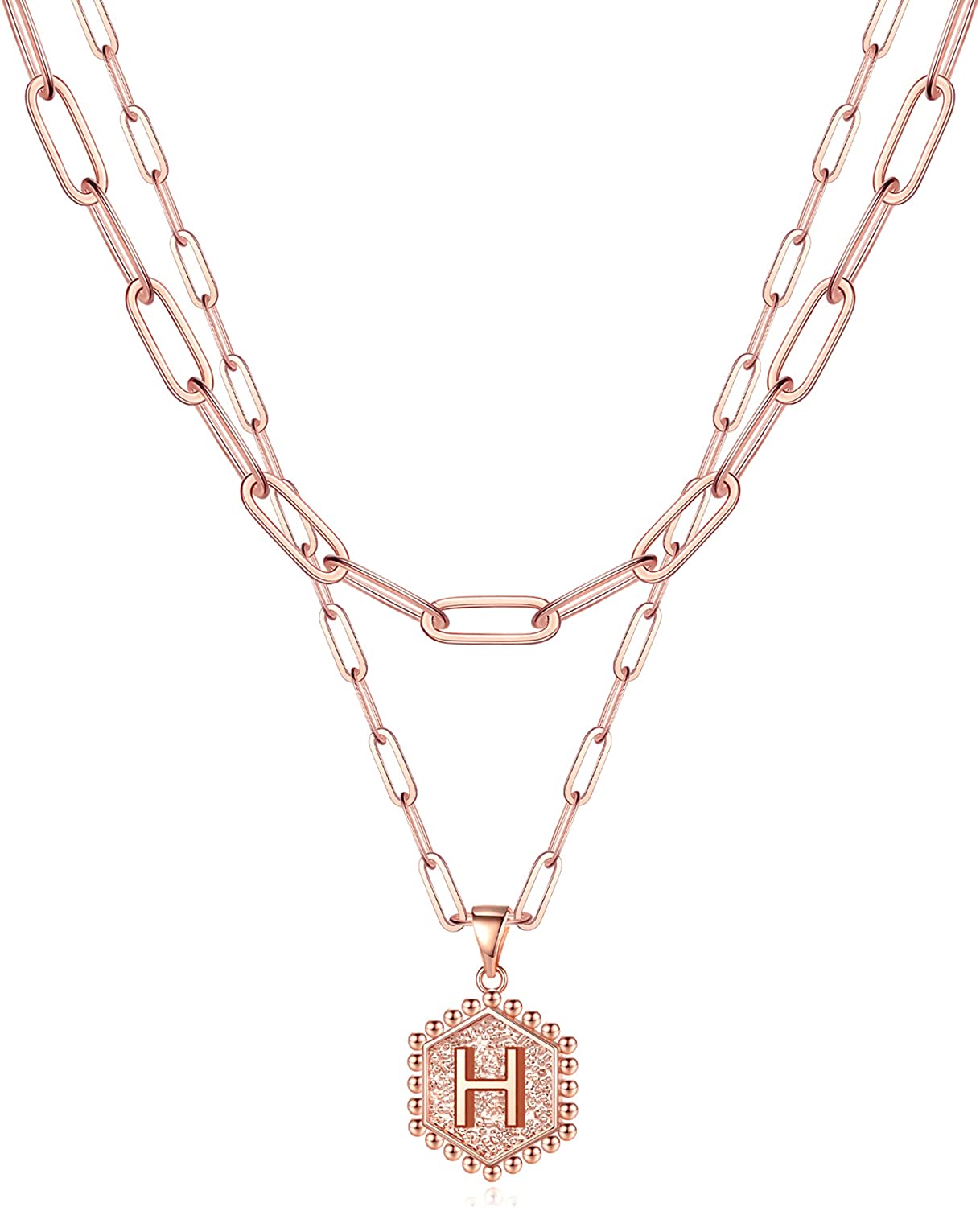 LAYERING INITIAL NECKLACES: Gold layered paperclip chain letter initial necklaces set with hexagon charm, engraved with initial and heart in back and front, large initial pendant dainty necklaces for women teen girls jewelry.