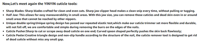 【Effective Jaw Design and Built-in Spring】YINYIN cuticle nippers professional have a scientific Jaw design which offers great grip for cutting cuticle off even in small areas around nails;The built-in spring can make our nail cuticle trimmer more flexible and durable,will not fall off,comfortable and simple during use.