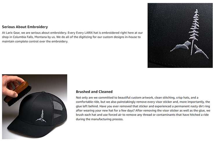 - SERIOUS ABOUT EMBROIDERY : Every Larix hat is embroidered right here at our shop in Columbia Falls Montana by us. It's our highest priority to achieve outstanding results by using the most advanced sewing technology and techniques available today.