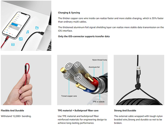 - Charging and Syncing】: The maximum total output current can be up to 4A (total, not each end), charge faster than most 4 in 1 cables and work better for tablets and quick charge devices.