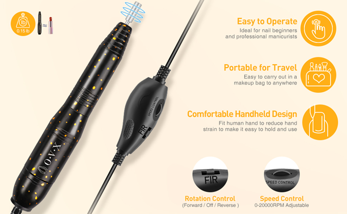 • Adjustable Speed&Direction: Varying speed from 0-20,000 RPM with speed controller. Can start out slow while getting used to it. Forward and Reverse rotation direction makes you feel easy to use both left and right hand do nail drill.