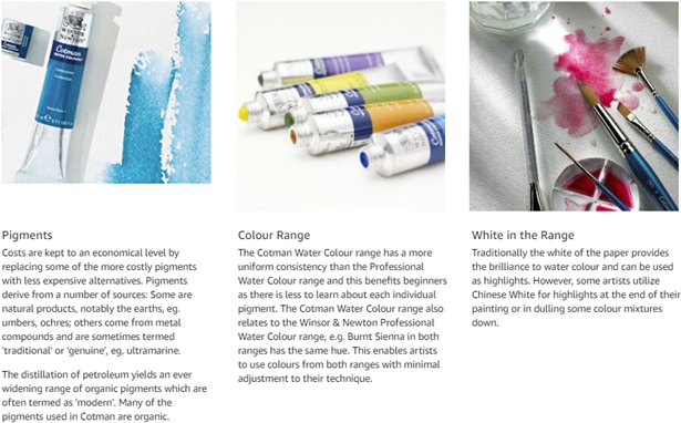 - Cotman Water Colors possess good transparency, excellent tinting strength and good working properties