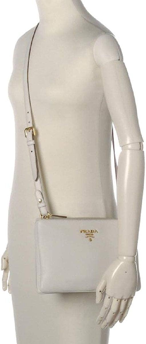 This Prada Women's White Vitello Phenix Leather Crossbody Handbag is a beautiful and elegant handbag that can be worn with everyday looks. It is practical yet luxurious and comes with an adjustable shoulder strap. The two exterior pockets are great for storage and organizing your personal belongings. The gold toned hardware and Prada Paris logo goes beautifully with this white Prada handbag.
