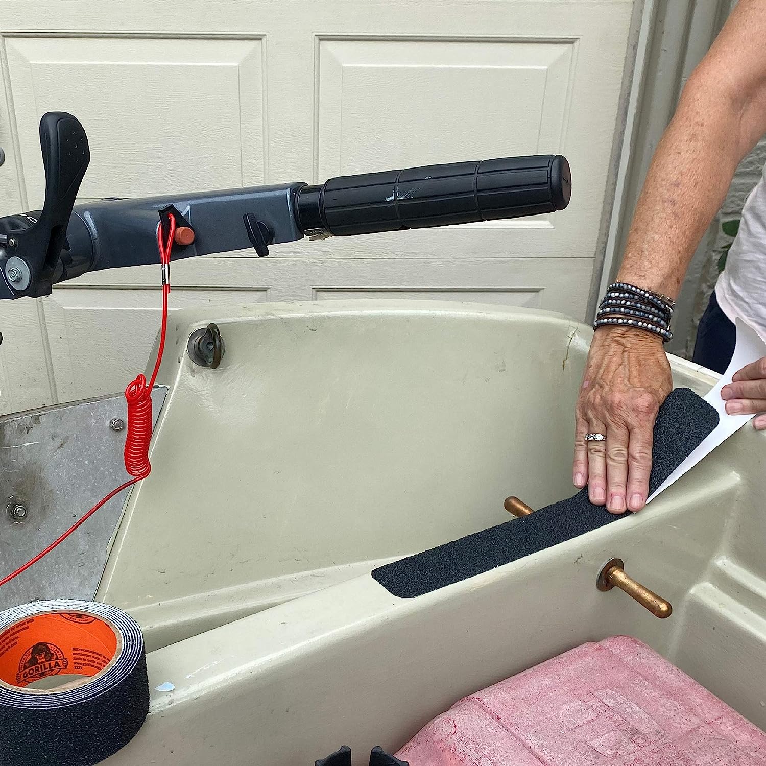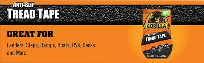 Gorilla Heavy Duty Tread Tape is designed to provide durable traction to wet, slick or high traffic areas. The multiple layers of protective coating ensure long lasting, durable grit that lasts both indoors and out. Gorilla Heavy Duty Tread Tape is perfect for ladders, steps, ramps, boats, RVs, decks, and more! DIRECTIONS: 1. Surfaces must be flat, dry and free of dirt, grease, and oil. Clean using isopropyl alcohol. Dry thoroughly. 2. Cut tape to desired length and round corners. 3. Remove liner and apply to surface starting at the center and moving toward the edges. IMPORTANT: Apply when temperature is above 39° F. In-use temperature range: -40° F to 220° F. Prime and seal all wood and concrete before use. Not recommended for areas with continuous water submersion such as pools, tubs, and spas. Avoid placing Tread Tape in grout lines, cracks or to bridge gaps. Warning. To help reduce the risk of slips, falls, and other serious or permanent injuries Gorilla Heavy Duty Tread Tape should be used only in accordance with its application directions. You are responsible for evaluating if Gorilla Heavy Duty Tread Tape is appropriate for your intended use and that it is being applied in accordance with its application directions. Gorilla Heavy Duty Tread Tape could become less effective or degrade over time. Gorilla Heavy Duty Tread Tape may be cleaned with a broom and appropriate, gentle cleanser as needed. Regularly inspect and maintain Gorilla Heavy Duty Tread Tape and replace as needed.