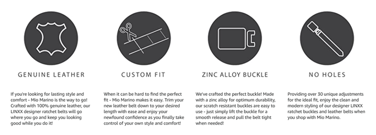 • NO MORE HOLES - Marino's Fashion Ratchet Belt provides 38 unique adjustments for a superb comfortable fit. Easy removable buckle allows you to cut the belt to your ideal size to give a primmer and custom tailored appearance!