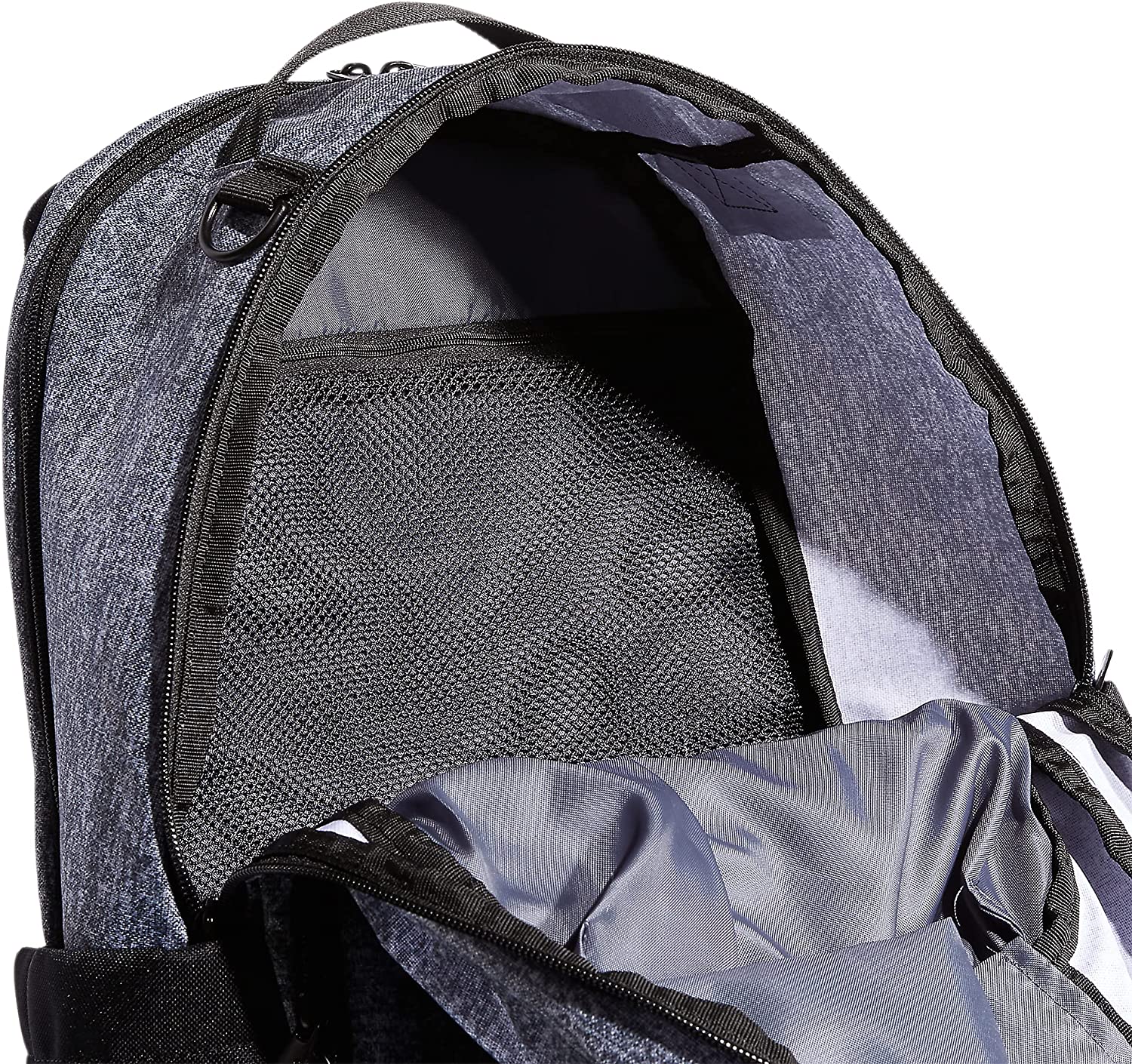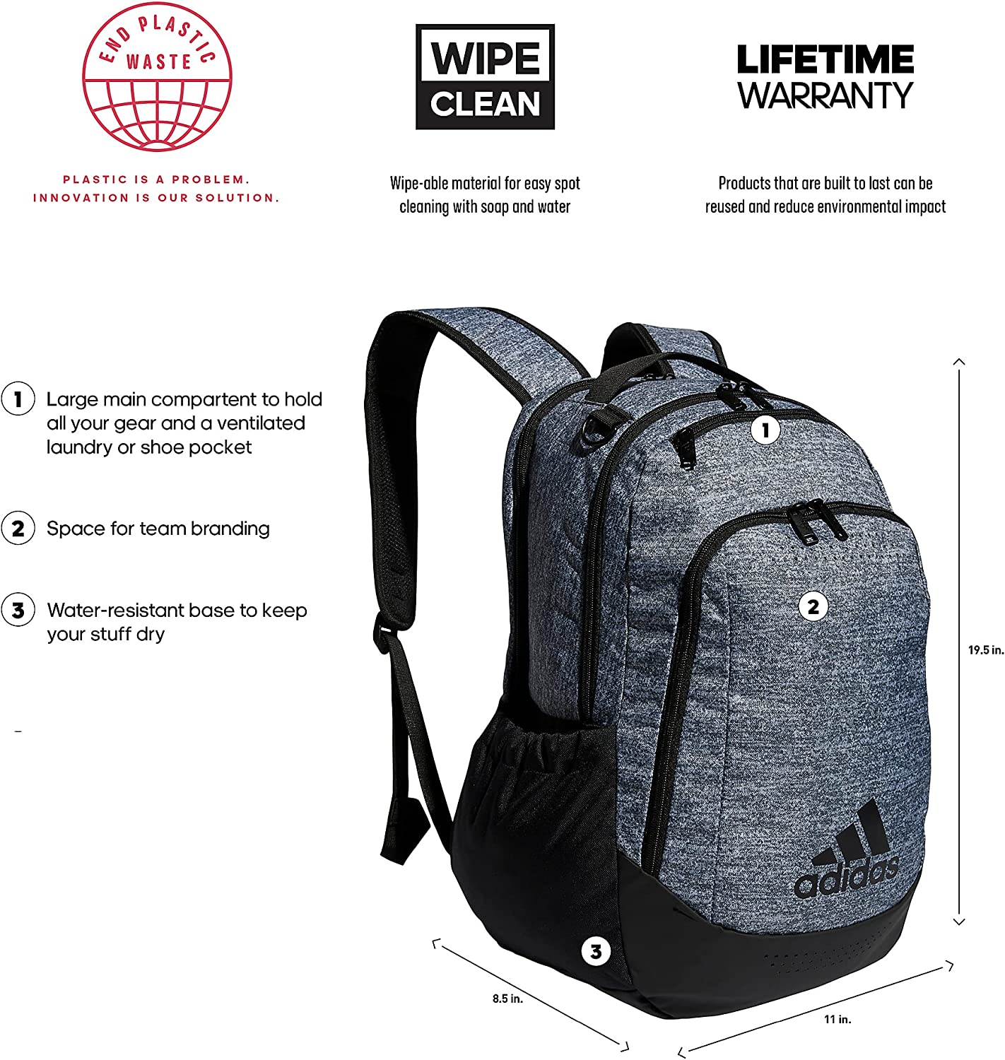 Carry everything you need for practice or the gym in this adidas backpack. the sturdy backpack has a main compartment and a separate ventilated shoe garage for wet or muddy items. the inner lining is easy to wipe clean with soap and water.