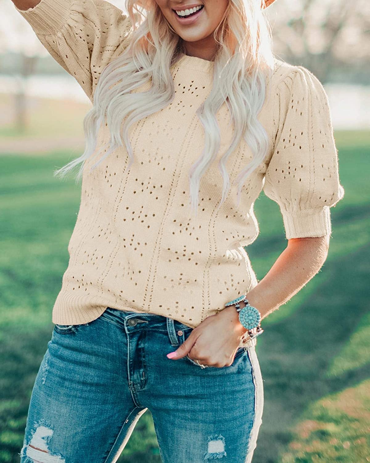 Saodimallsu Womens Cute Short Puff Sleeve Sweaters Loose Crew Neck Lightweight Pointelle Knit Pullover Shirts Tops