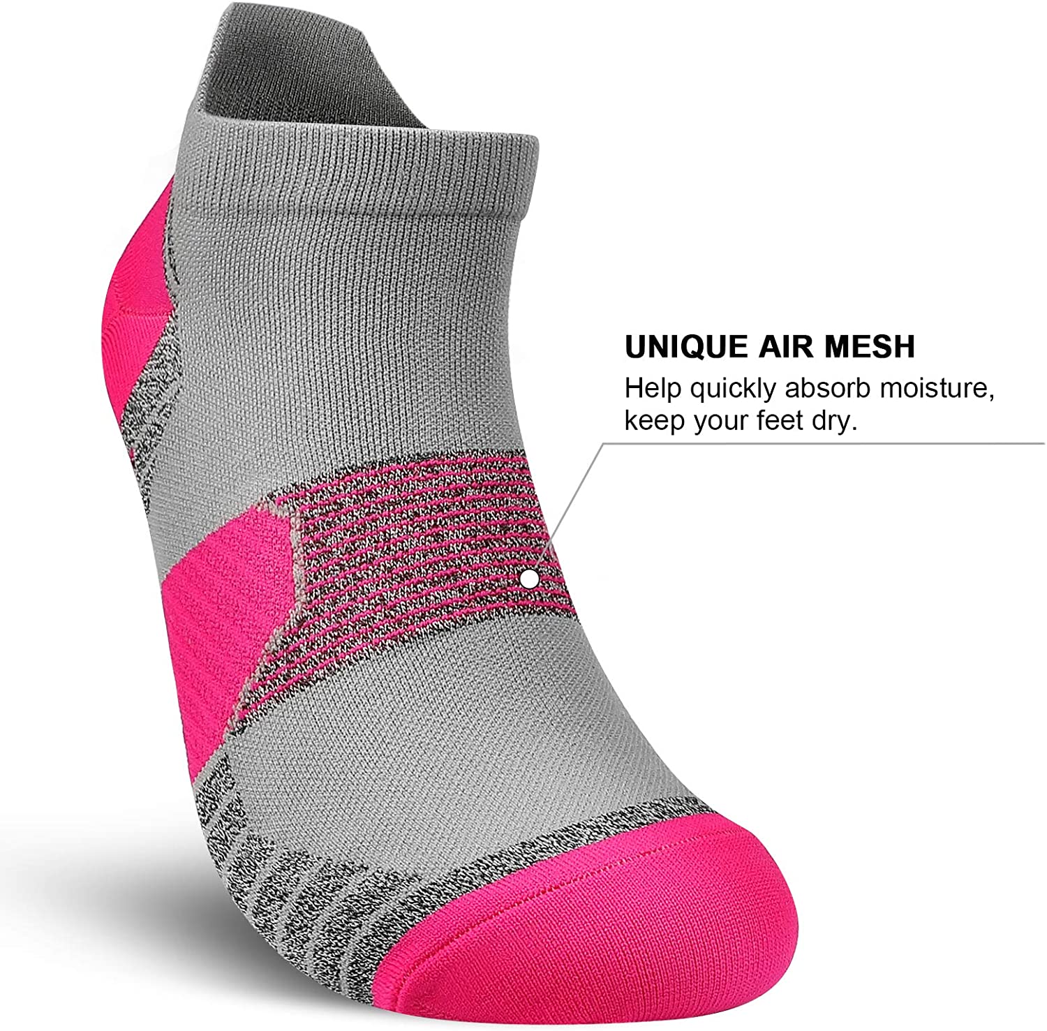 [MESH DESIGN & BREATHABLE] These compression ankle socks for women are made of high-quality material, which can quickly absorb moisture and release sweat. Mesh ventilation in the arch reduces heat and increases perspiration, good moisture-wicking performance to help your feet keep cool and breathable all-day long