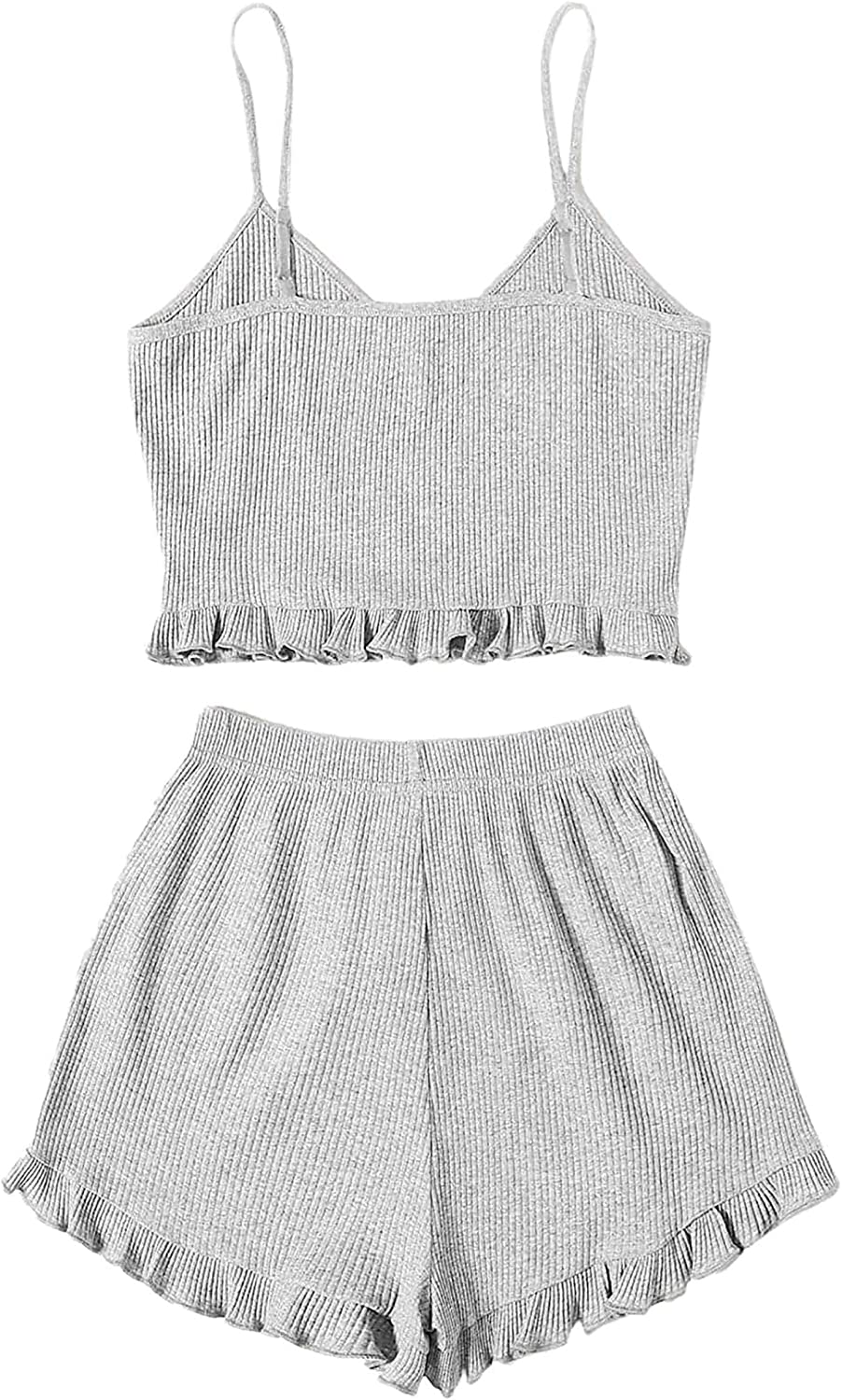[Feature]: Two piece pajama set for women feature with adjustable spaghetti strap, knit ribbed crop top set, ruffle trim, sexy v neck cami top and elastic waist shorts, sleeveless pjs sets for girls
