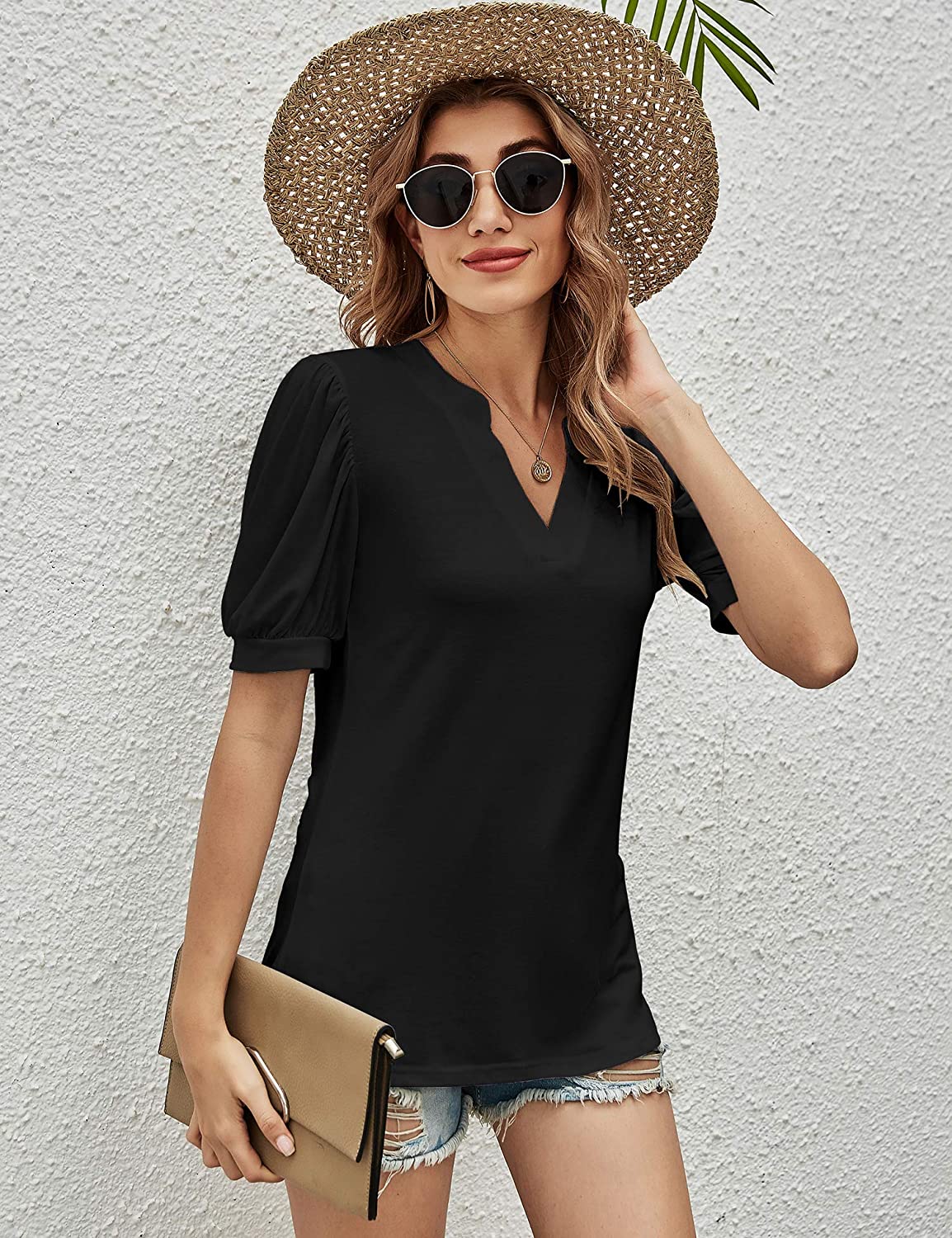 Romanstii Women Casual V-neck T-Shirts Loose Puff Short Sleeve Tops Tunic Blouses