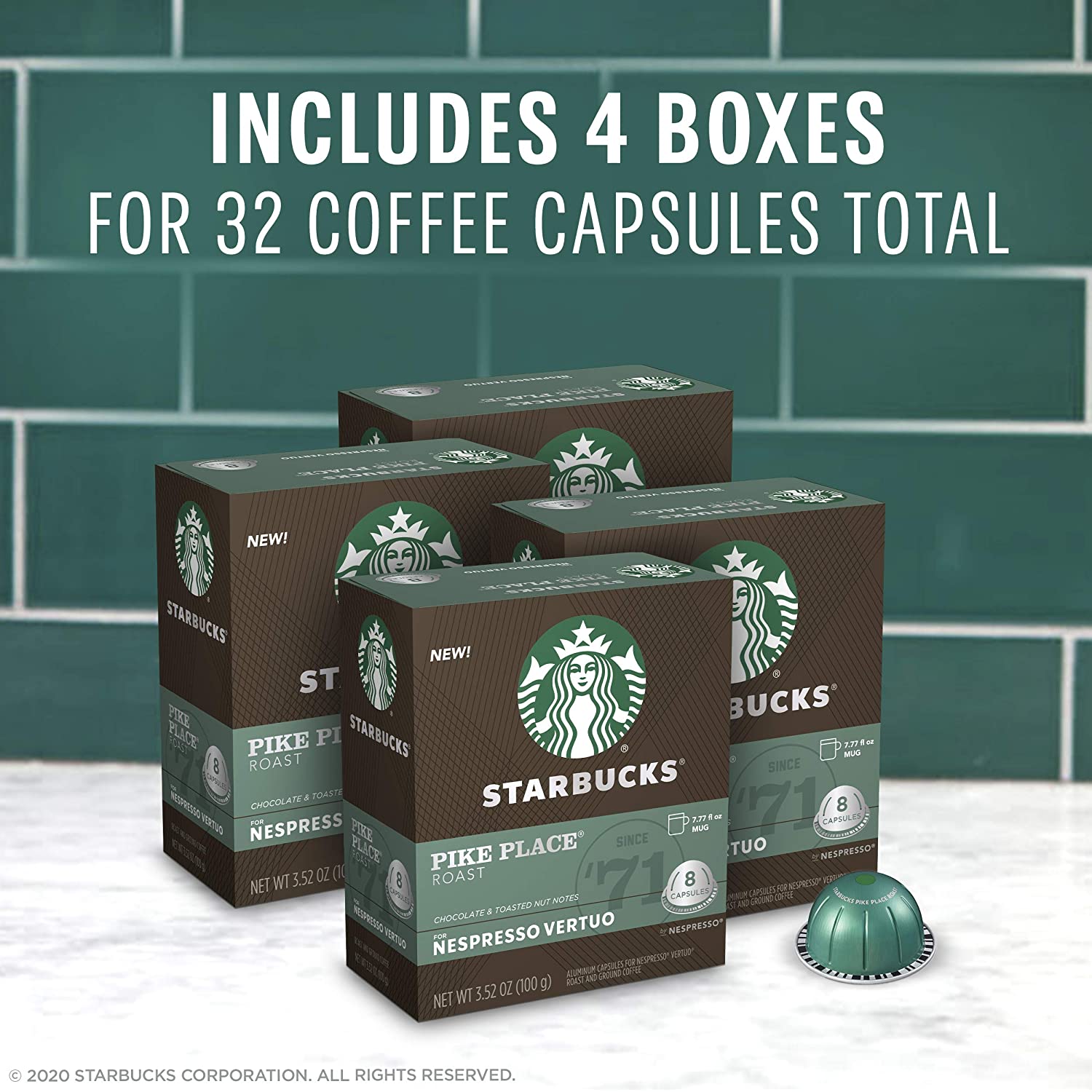 INCLUDES: Enjoy the Starbucks coffee you love with four boxes of 8 capsules of Starbucks Pike Place Roast medium roast coffee for a total of 32 capsules for Nespresso Vertuo machines
