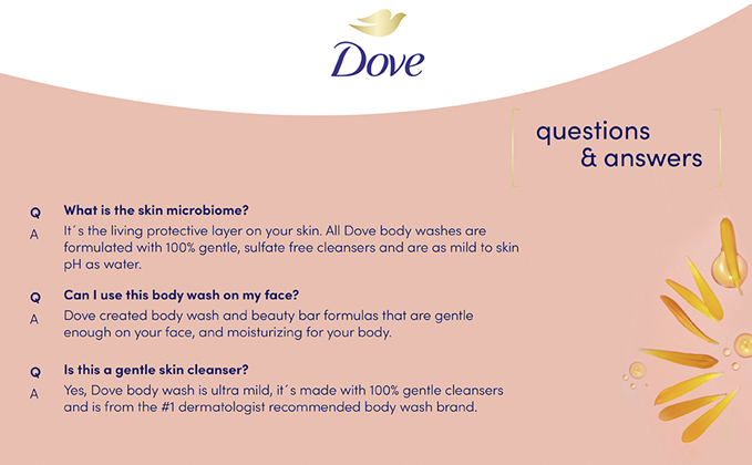 • PLANT-BASED MOISTURIZER: With naturally derived cleansers and skin-natural nutrients, Dove’s moisturizing body cleanser is microbiome gentle, sulfate free and paraben free.