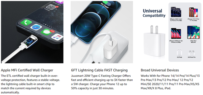 - Excellent Safety Fast Charging: Juusmart 20W lightning charger has multipotent safety system ensures complete protection for your lightning devices. The ETL certified wall charger built-in over-voltage protection, features a stable voltage. Lightning cable built-in smart chip to match the current required by devices automatically to protect your iPhone/iPad from overcurrent, overvoltage, short circuit and overheating.
