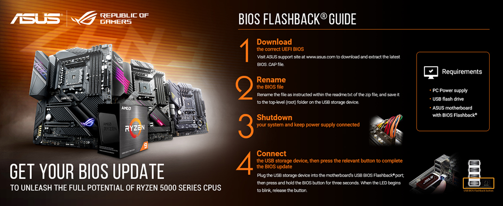 • Please ensure your BIOS is up to date if installing a compatible Ryzen 5000 series CPU. Visit ASUS site search by motherboard model name, click on “Support” tab, Drivers and Tools, then BIOS and Firmware to download the latest BIOS