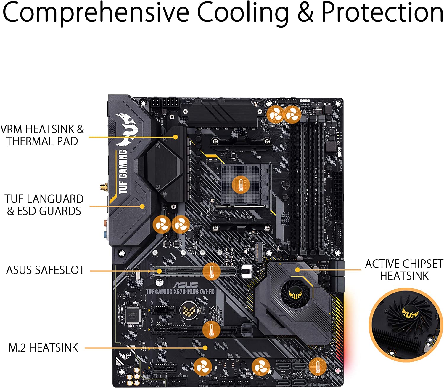 • Comprehensive Cooling: Active PCH heatsink, VRM heatsink, M.2 heatsink, hybrid fan headers and Fan Xpert