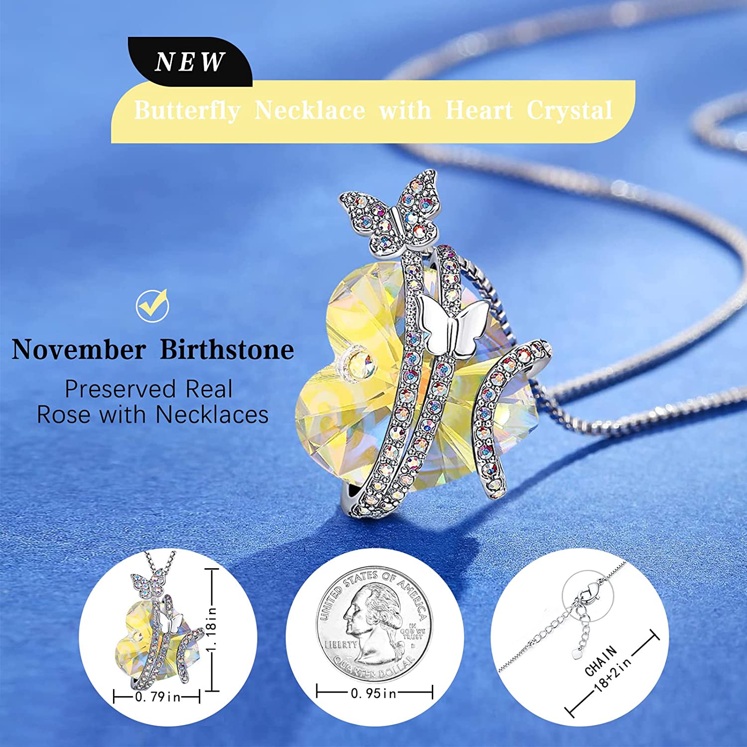 Butterfly Necklace delivered in an preserved real rose jewelry box, easy gift-giving, save your valuable time and effort. Our butterfly birthstone necklace can provide 12 colors crystals (Each color corresponds to a birth month) and 2 kinds of packaging form, to meet your different needs
