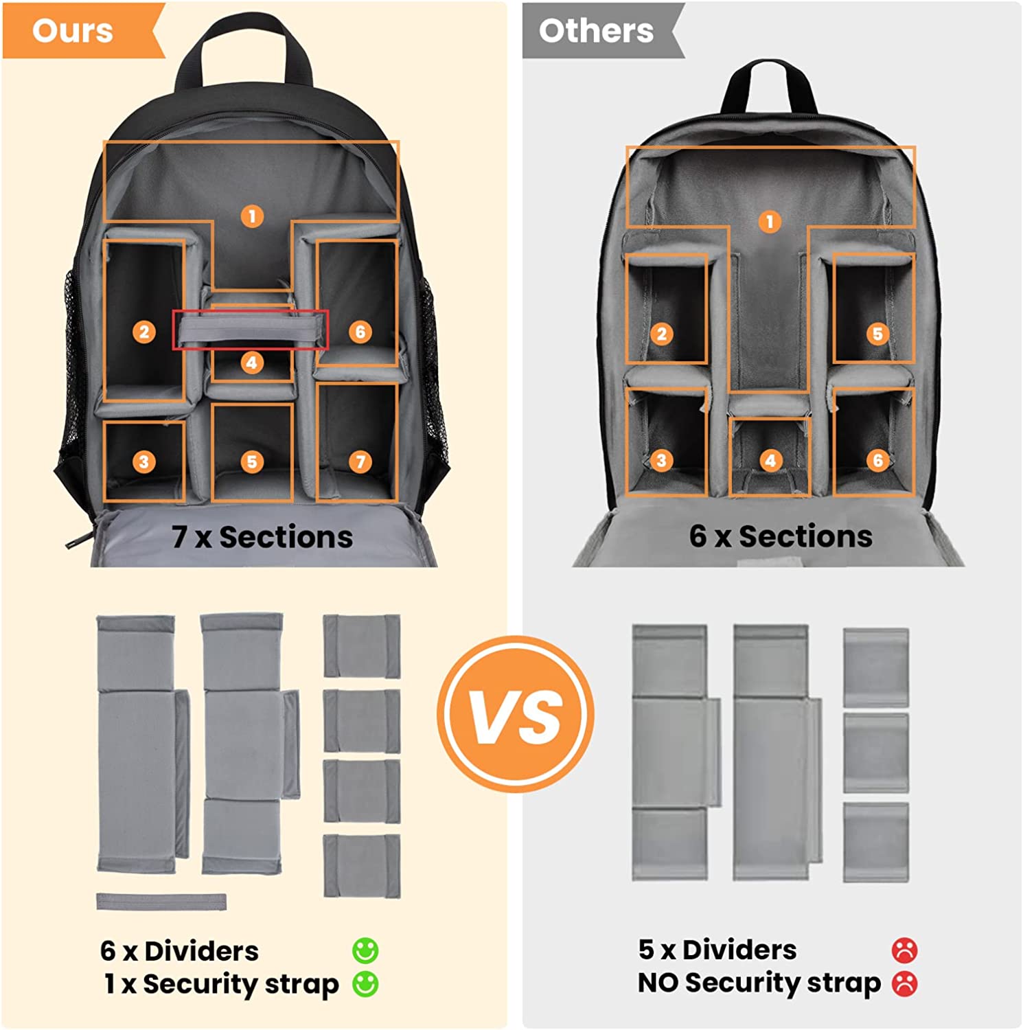 Dedicated camera compartment with removable padded dividers; fits 1 camera 6 lenses at once. Can be used as a daily backpack just take out the dividers to arrange your various daily goods such as clothes, cellphones, books, and so on.