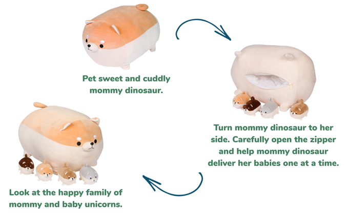• FIVE TOYS IN ONE : The pixie crush unique stuffed animal mommy corgi puppy comes with a surprise in her belly, 4 baby puppies that can be removed through the zippered opening on mommy’s tummy.