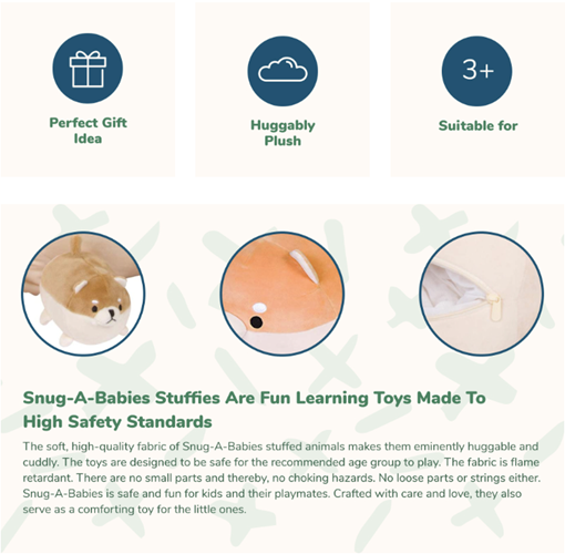 • HUGGABLY PLUSH : Each of the animals are designed with snuggles and cuddles in mind so we use the softest and plushest materials to make them perfect for hugging and cuddling.