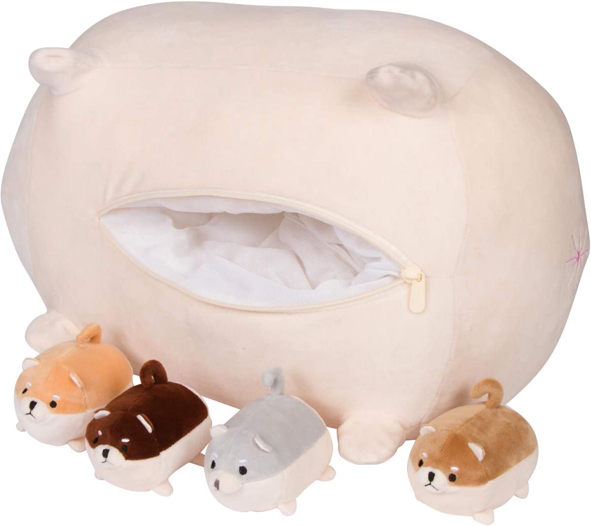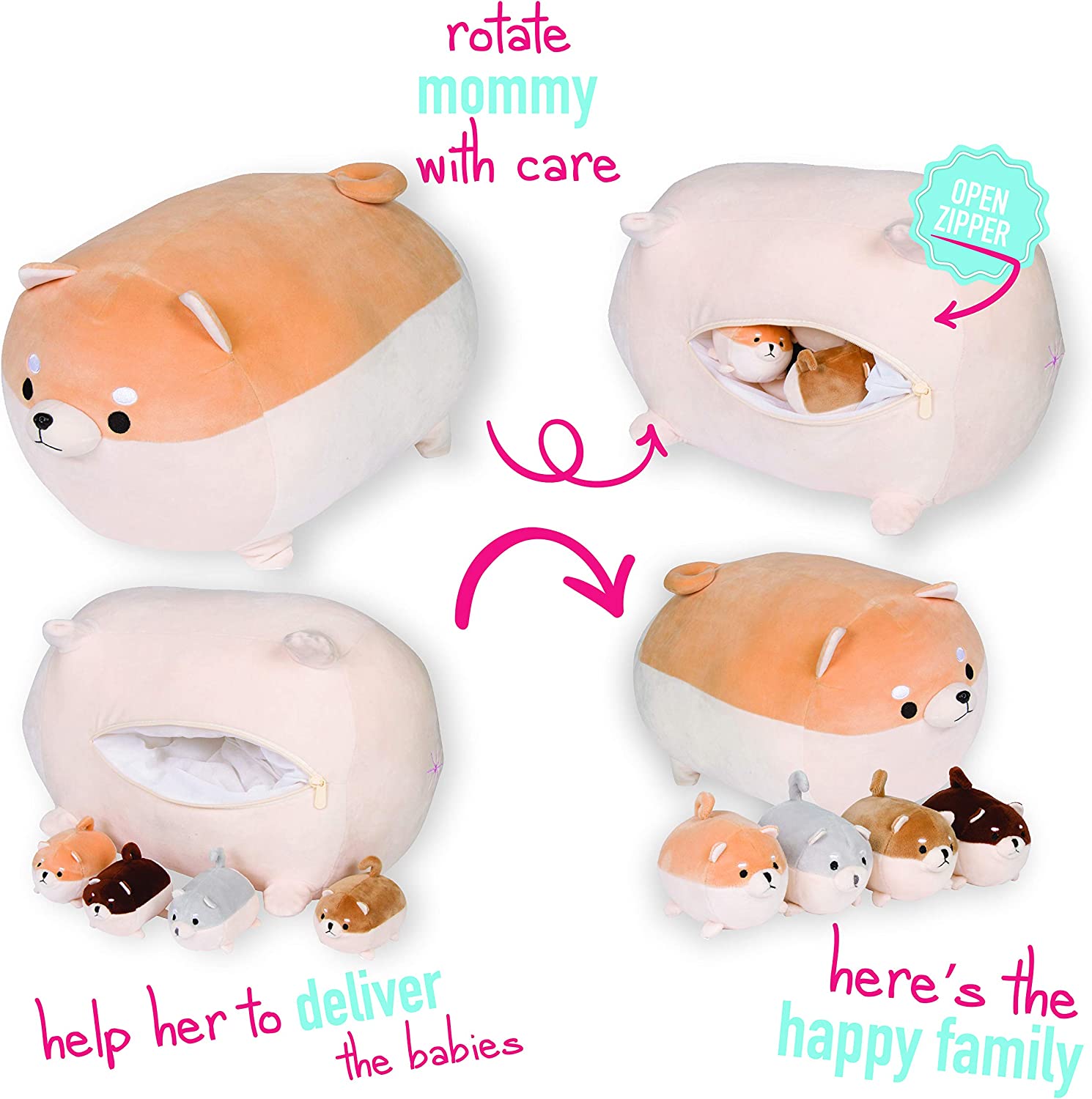 PixieCrush Shiba Inu Stuffed Animals Mommy with 4 Baby Puppies in Tummy - Snugababies Plush Toy Anime Corgi & Akita Kawaii Dog Soft Pillow; Plush Toy Gifts for Boys Girls