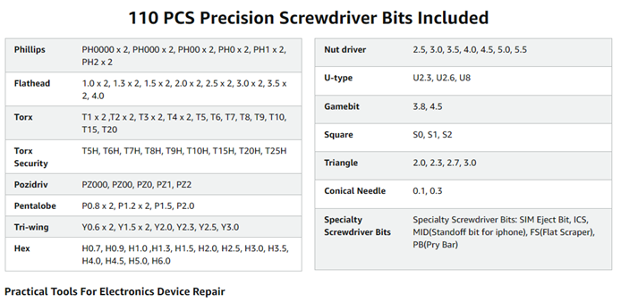 | Head Style | Phillips, Flat Head, Torx, Torx Security, Pentalobe, Hex, Tri-Wing, Pozidriv, Nut Driver, Square, Gamebit, Spanner, Triangle, Standoff, SIM Eject, etc |