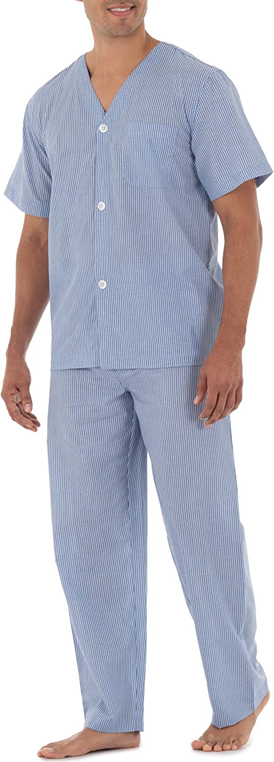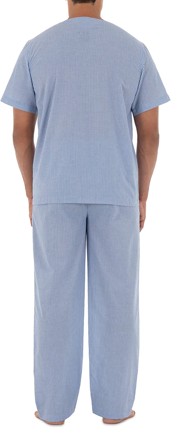 These quality pajamas will keep you cool and comfortable. Constructed with easy care fabric, these pajamas are soft and smooth. The V neck styled top features a button front and patch pocket. The pants have a covered elastic waistband with an adjustable button closure and button fly.