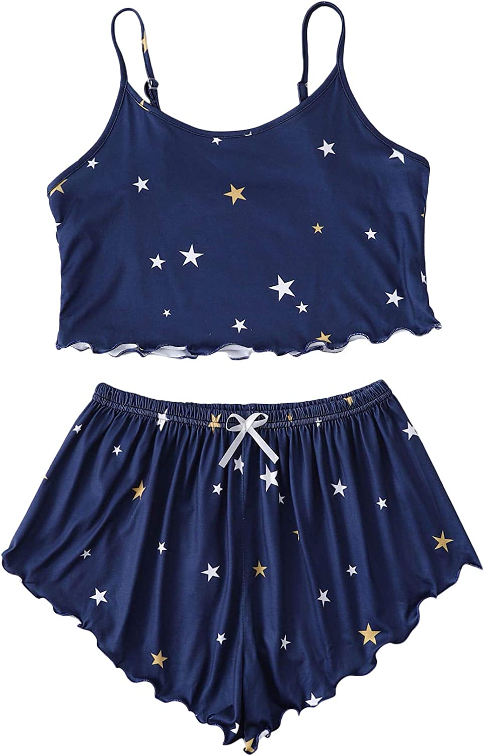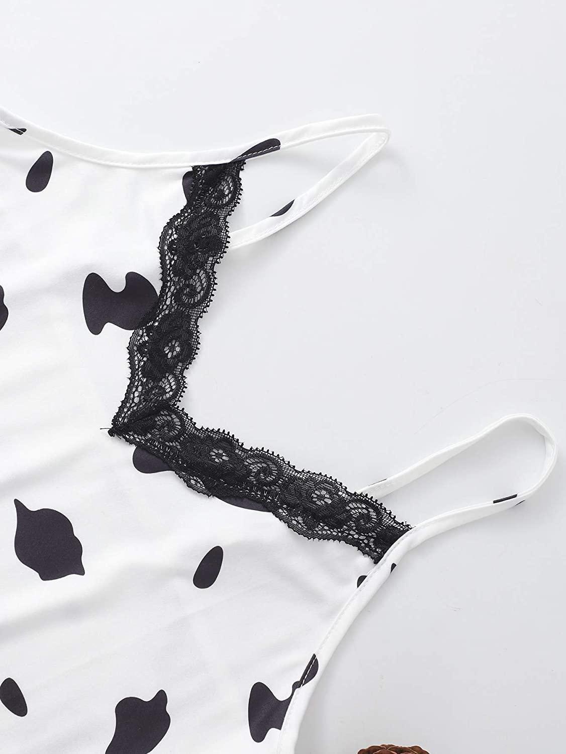 SheIn Women's Cow Print Sleepwear Lace Frill Trim Crop Cami Top and Shorts Pajama Set
