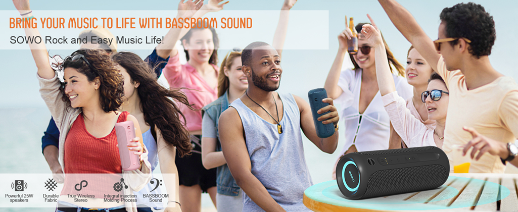 - [BASSBOOM BASS AND WIRELESS STEREO SURROUND SOUND]: The BASSBOOM technology designed by SOWO portable Bluetooth speaker improves the bass by 28% on the original basis, enhancing stronger auditory enjoyment.The wireless speaker with bluetooth supports TWS function, you can purchase two speakers at the same time to truly enjoy the stereo surround sound of a movie theater by pairing the TWS function.