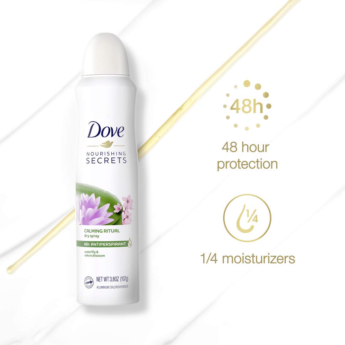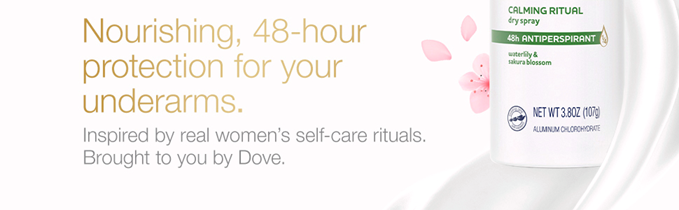 Who doesn't dream about a calm morning routine? Our calming ritual dry Spray Antiperspirant Deodorant waterlily & Sakura blossom is just the thing to keep you feeling calm, comfortable and confident first thing in the morning, without compromising on care and all-day protection. This Dove Nourishing secrets dry Spray Antiperspirant Deodorant for women will help you transform your daily self-care routines into luxurious rituals. Inspired by self-care rituals of real women, Made with 0% alcohol (ethanol) and enriched with Dove 1/4 moisturizers, this non-irritating antiperspirant formula leaves you with comfortable, beautifully soft underarms while keeping underarm sweat and odor at bay for up to 48 hours. But that's not all. This dry spray combines the sophisticated, sparkling scents of waterlily and Sakura blossom with comforting notes of sandalwood in a nature-inspired fragrance that's been created with responsibly sourced ingredients - so you can enjoy a calming ritual without compromising on care. It'll infuse your days with a small, but indulging ritual that's there for you and you alone, no matter what. For best results, Spray each underarm with two or three short bursts from about 6 inches away. Apply this Dove Antiperspirant Deodorant to dry skin after showering and enjoy fresh, comfortably dry skin from morning to night. This antiperspirant deodorant spray dries instantly, so you don't have to wait or worry.