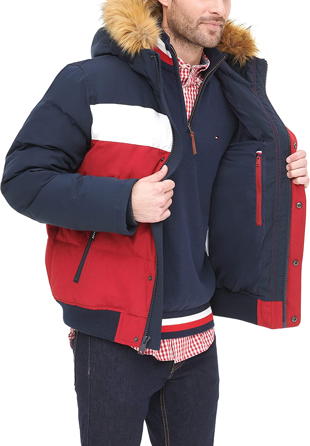 - Classic Tommy Hilfiger flag embroidery on left chest, round rubber logo patch on left sleeve, and "HILFIGER" screen-print down back lining fabric