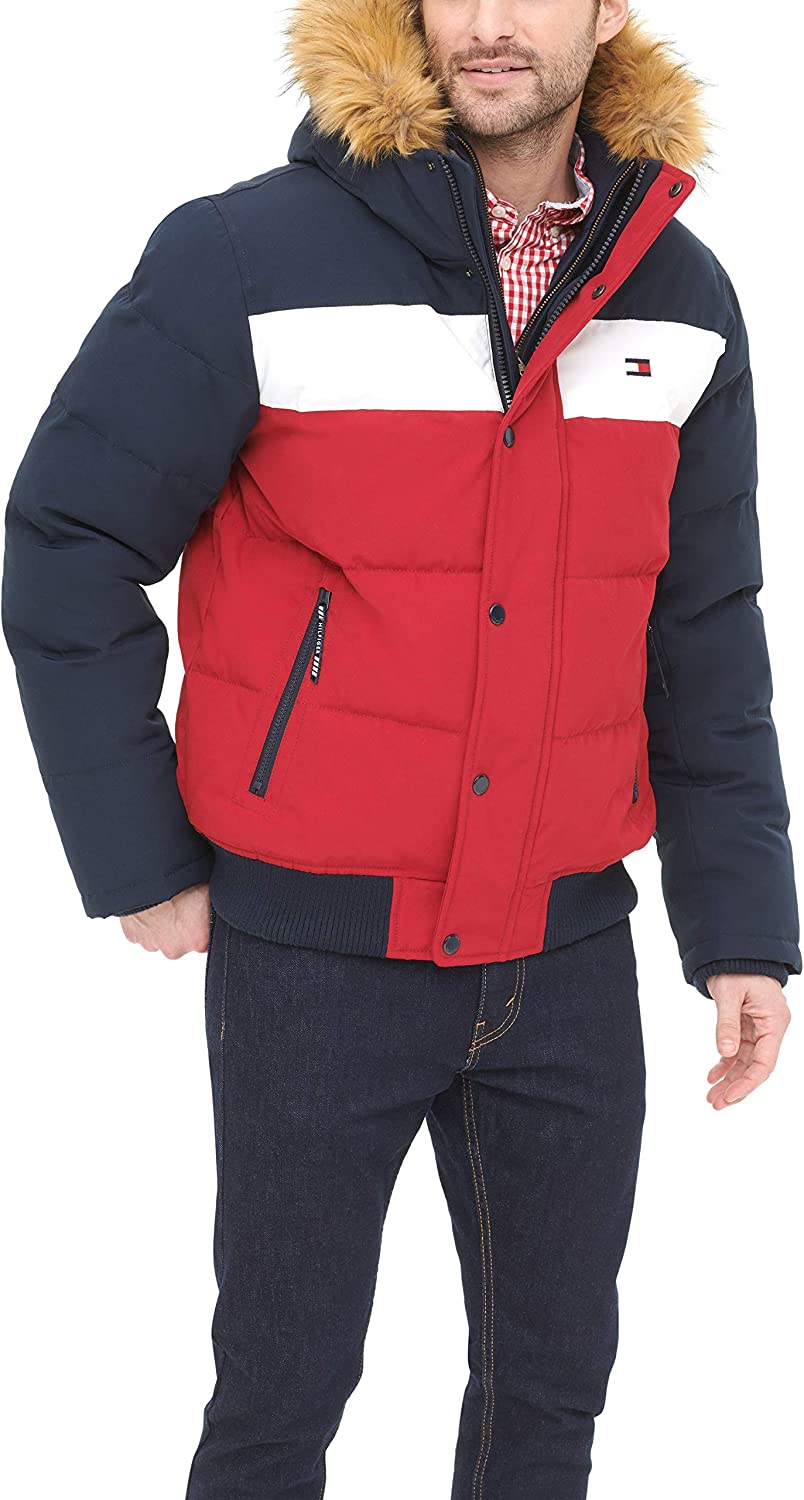 - Quilted snorkel bomber jacket in a wind and water resistant arctic cloth with a detachable faux fur trimmed hood