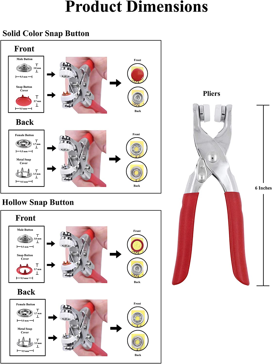 Button snaps starter set in bulk; 804 pieces total; 20 sets each color; 200 sets total; Button diameter: 9.5 mm or 0.37 In; Plier length: 6 Inches; Color: red, white, black, green, pink, light blue, blue, yellow, orange, purple