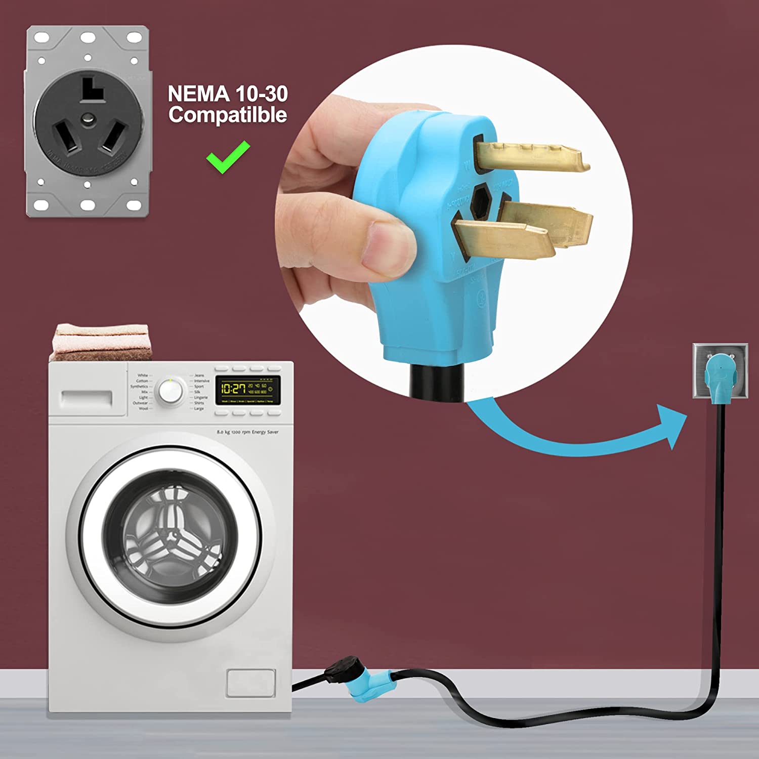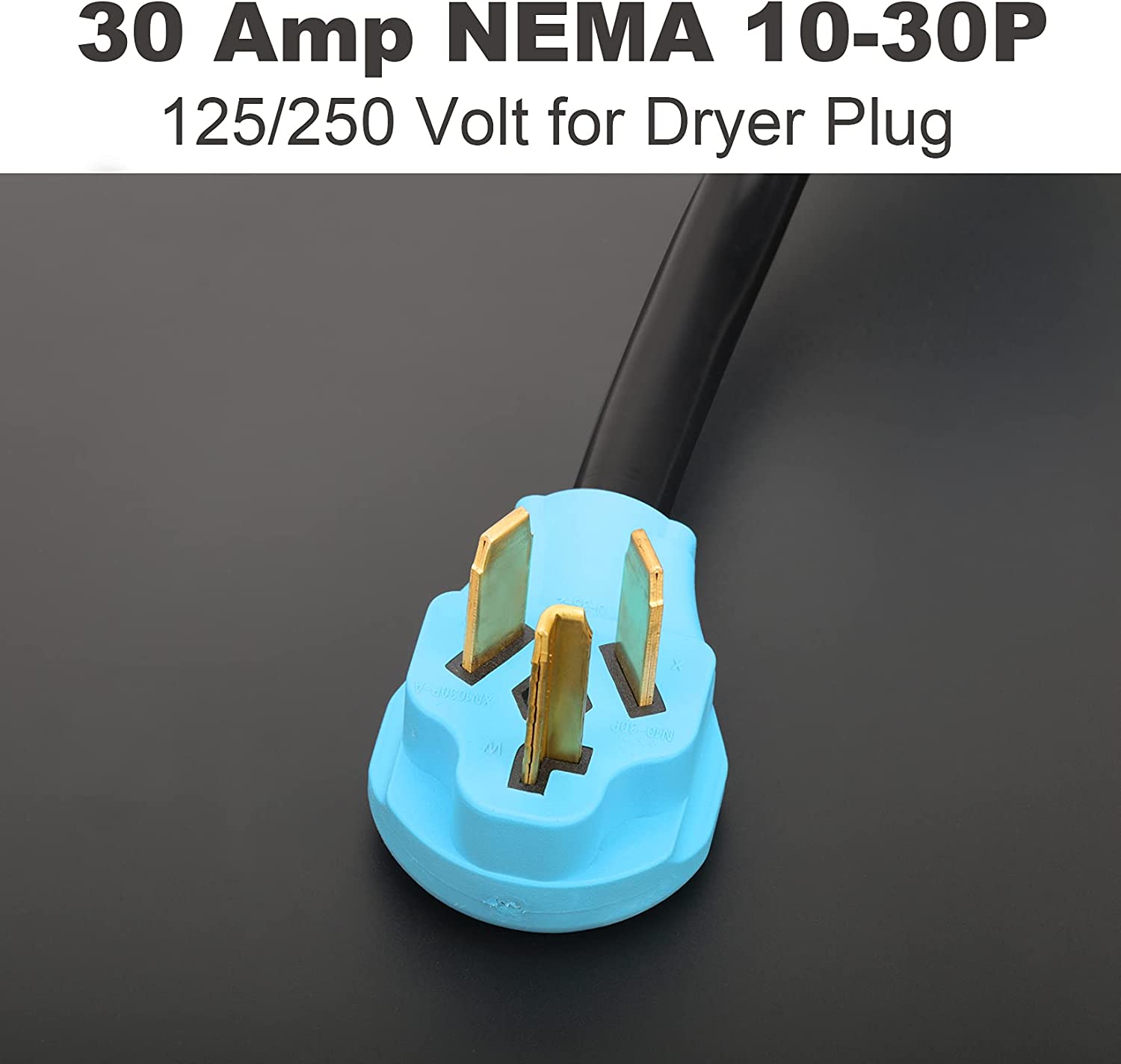- 【ELECTRICAL RATING】 30A, 125/250V, max wattage 7500 watts, 10 feet, STW NEMA 10-30P male plug and NEMA 10-30R female receptacle, for 3 prong dryer outlet.