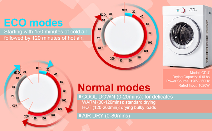 - 【ECO modes】starting with 150 minutes of cold air, followed by 120 minutes of hot air.In ECO mode, if the knob does not start to rotate from 70 minutes, you need to manually unplug the power supply, the dryer will stop working.Different from the normal temperature blowing in the last twenty minutes of normal mode, no matter whether SENSOR DRY is turned on or not, ECO mode will use the humidity sensor to judge in the last twenty minutes. If the clothes are not dry enough, it will be hot air.