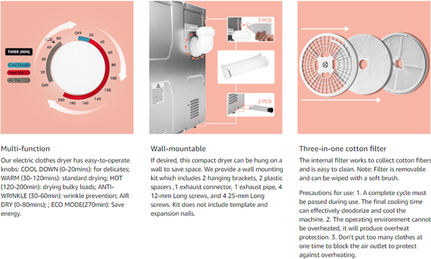 - 【Evenly heated】 This portable clothes dryer has a large-diameter, stainless steel and a special internal physical structure to deliver the best possible drying experience. These features ensure sufficient clothes rotation, prevent tangles, remove wrinkles, Evenly heated and leaves your clothes fluffy and comfortable.(In order to ensure the service life of the product, it is necessary to rest for 1 hour after working for a long time before proceeding to the next work)