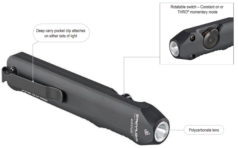 The Wedge is a compact high-performance EDC light, designed for clean pocket carry. Outfitted with an intuitive rotating thumb switch providing tactile control over the constant-on and THRO (Temporarily Heightened Regulated Output) modes. A waterproof USB-C port in the tail offers universal and convenient charging of the integrated lithium-ion battery. Switchable pocket clip allows for concealed carry in either pocket. Made of rugged anodized aluminum the Wedge balances durability with performance.
